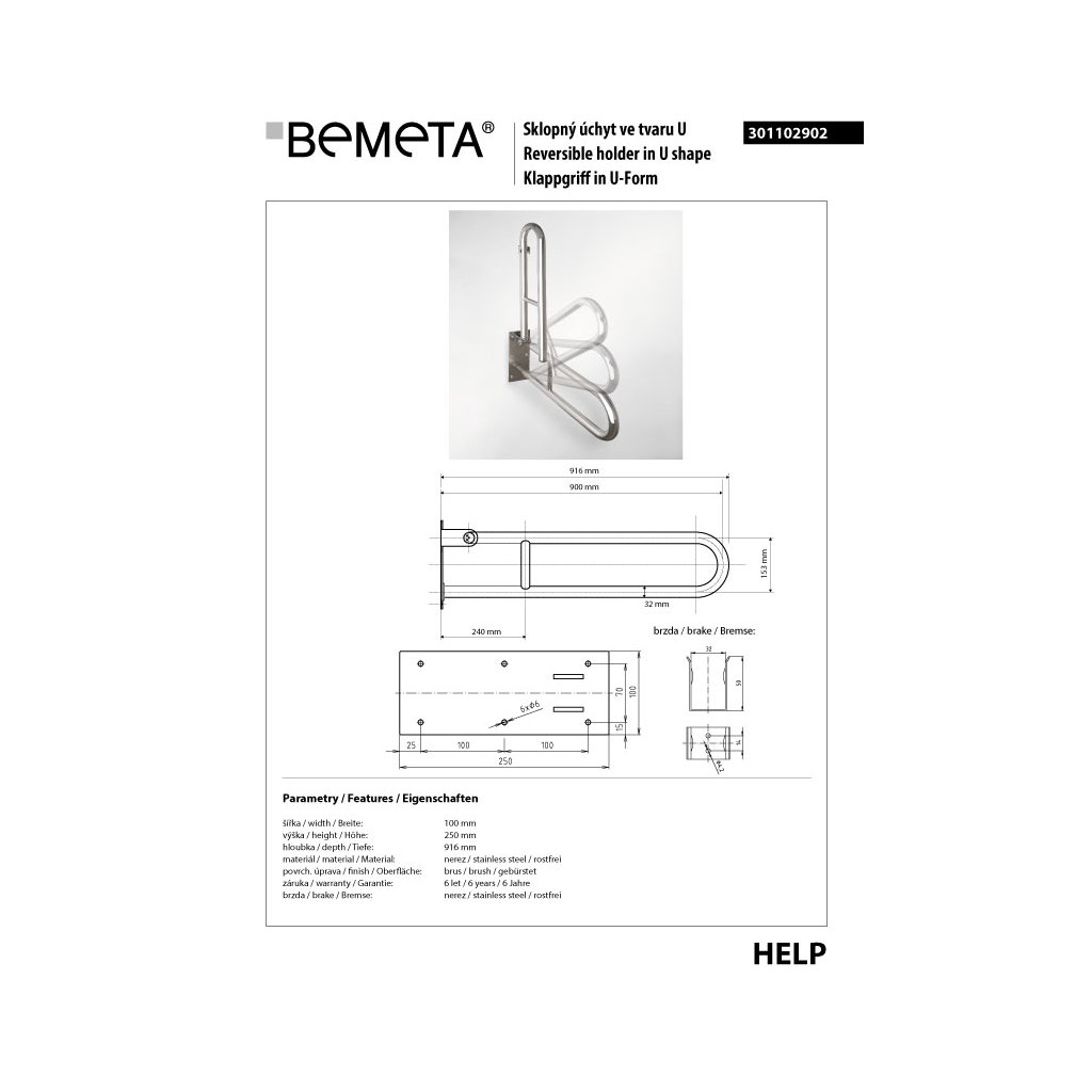 HELP: Sklopný úchyt ve tvaru U 900 mm, nerez, brus, bez krytky - 301102902