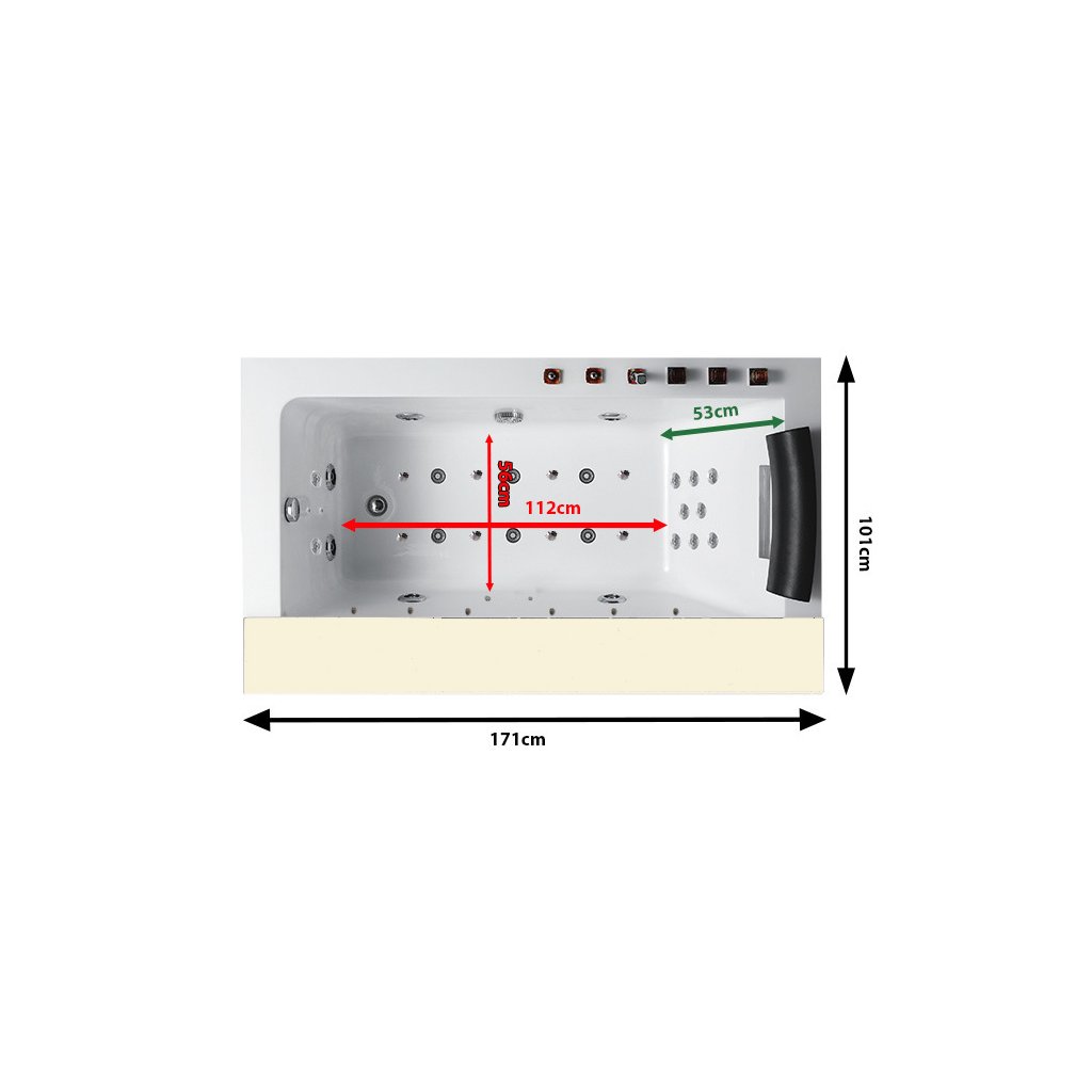 - 4 trysky na bocích vany (směrové/rotační)