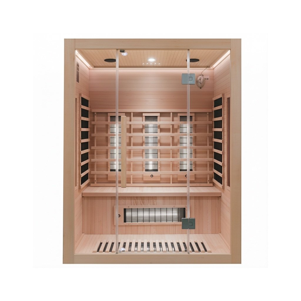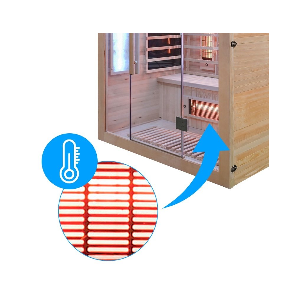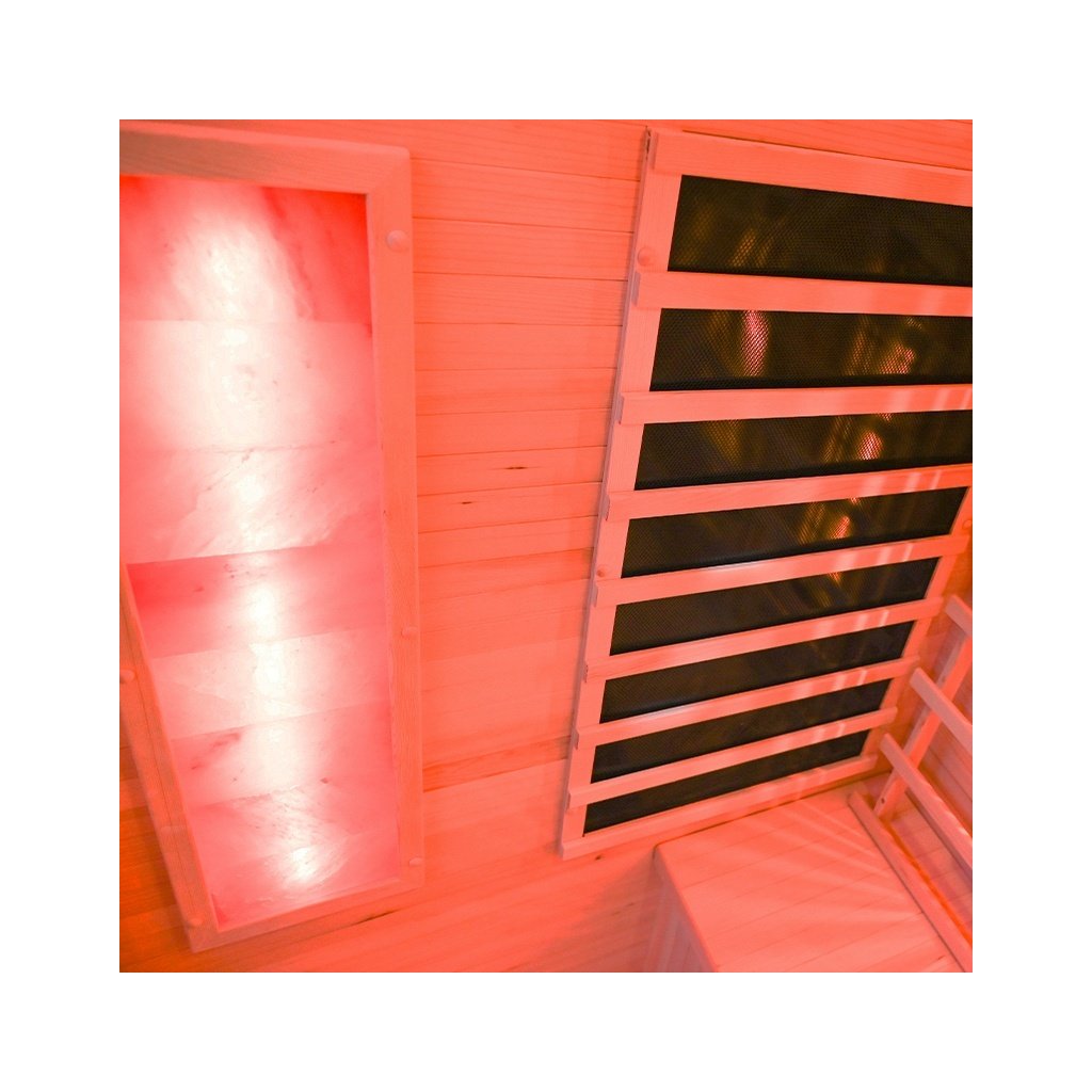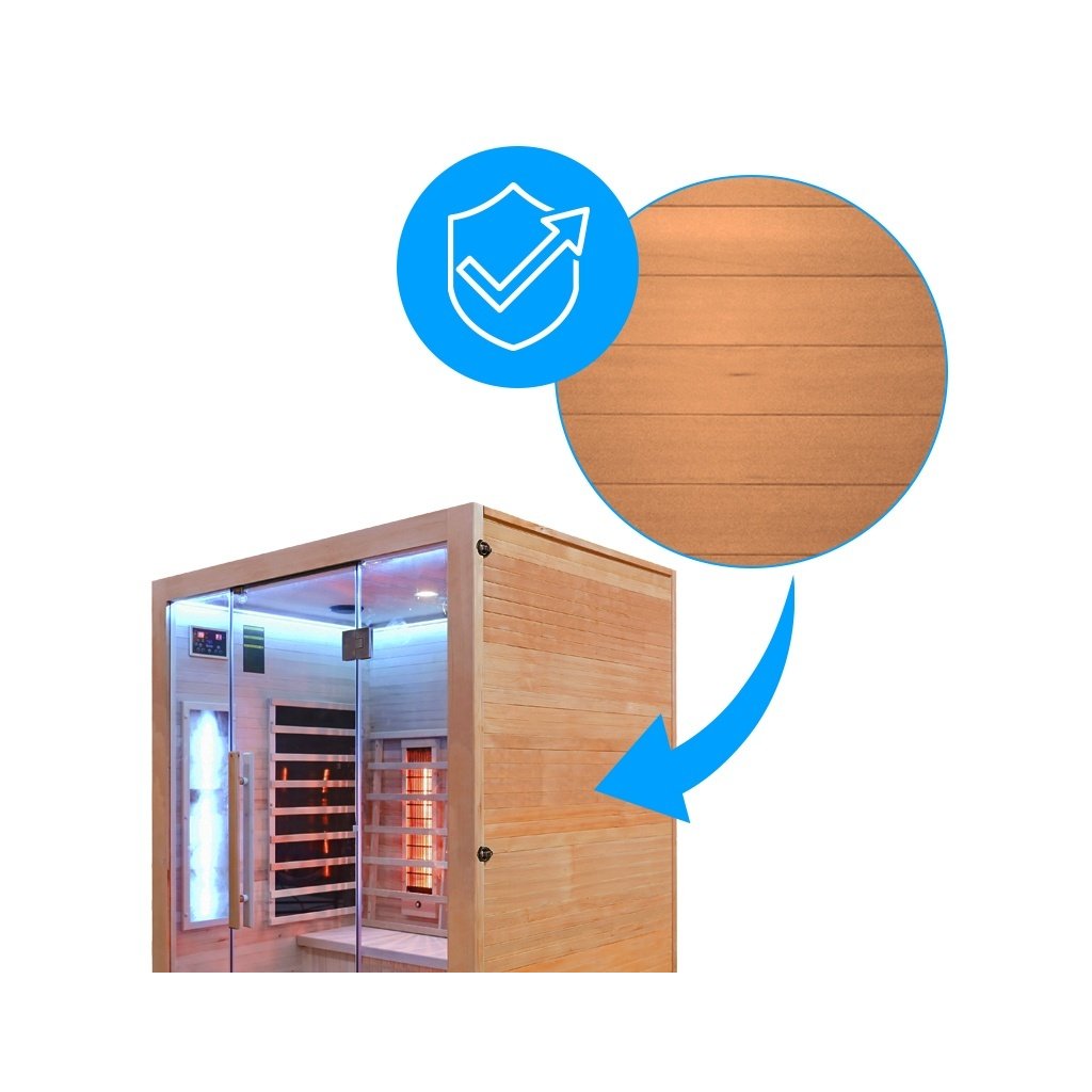 - Sauna je vyrobena z Kanadského jedlovce - Hemlock. Jedná se o nejideálnější materiál pro výrobu infrasaun. Dřevo Hemlock neobsahuje pryskyřici a nevypouští žádné vůně.
