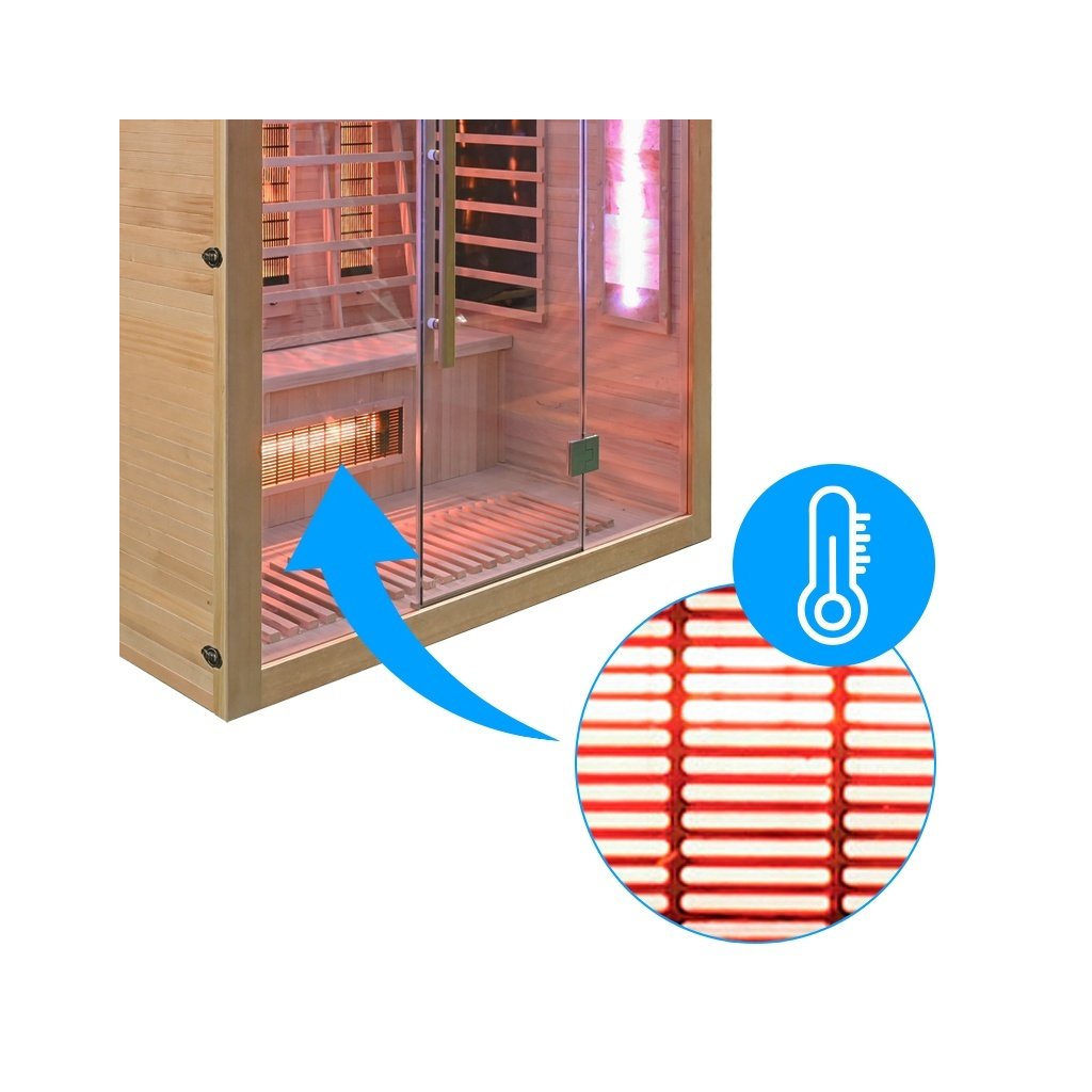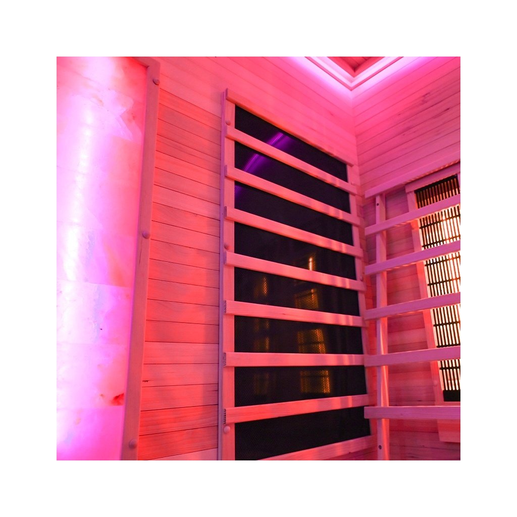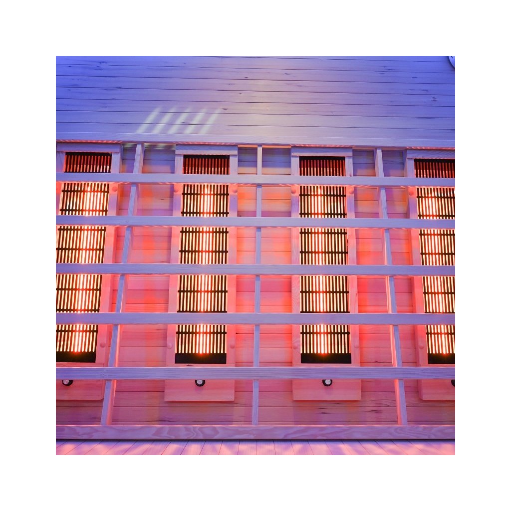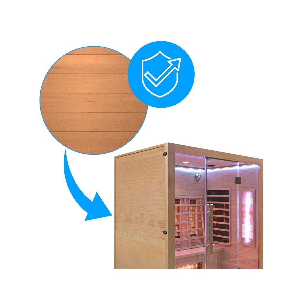 - Sauna je vyrobena z Kanadského jedlovce - Hemlock. Jedná se o nejideálnější materiál pro výrobu infrasaun. Dřevo Hemlock neobsahuje pryskyřici a nevypouští žádné vůně.