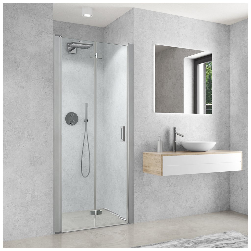 Tyto dveře mají profily z ušlechtilého hliníku v provedení Brillant. Výplně bezpečnostních skel nabízíme v nadčasovém provedení Transparent (čiré sklo). Produkt disponuje skládacími dveřmi, díky kterým si zajistíte ještě širší a pohodlnější vstup do sprchy. Skládací dveře je možné složit zcela ke zdi díky otočným stěnovým profilům.