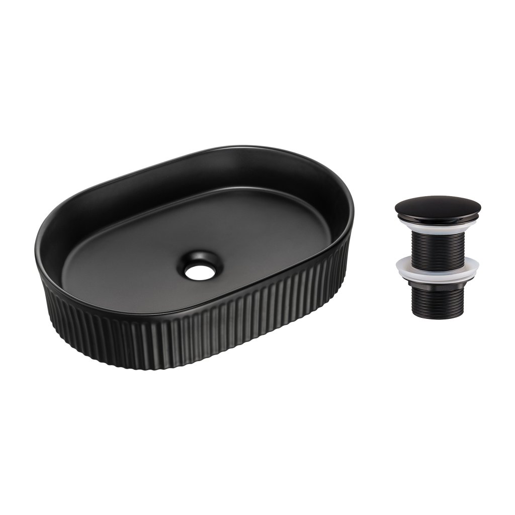 Součástí této praktické sady je výpusť typu Click-Clack s keramickou zátkou v identické černé matné barvě. Mechanismus výpusti je vyroben z odolného kovu a pracuje na principu jednoduchého stlačení, což umožňuje pohodlné ovládání odtoku vody bez nutnosti instalace táhla. Sestava je navržena pro postavení na koupelnovou desku nebo skříňku a díky svým kompaktním rozměrům je vhodná i do středně velkých koupelen, kde se stane výrazným estetickým akcentem vnášejícím do interiéru harmonii.