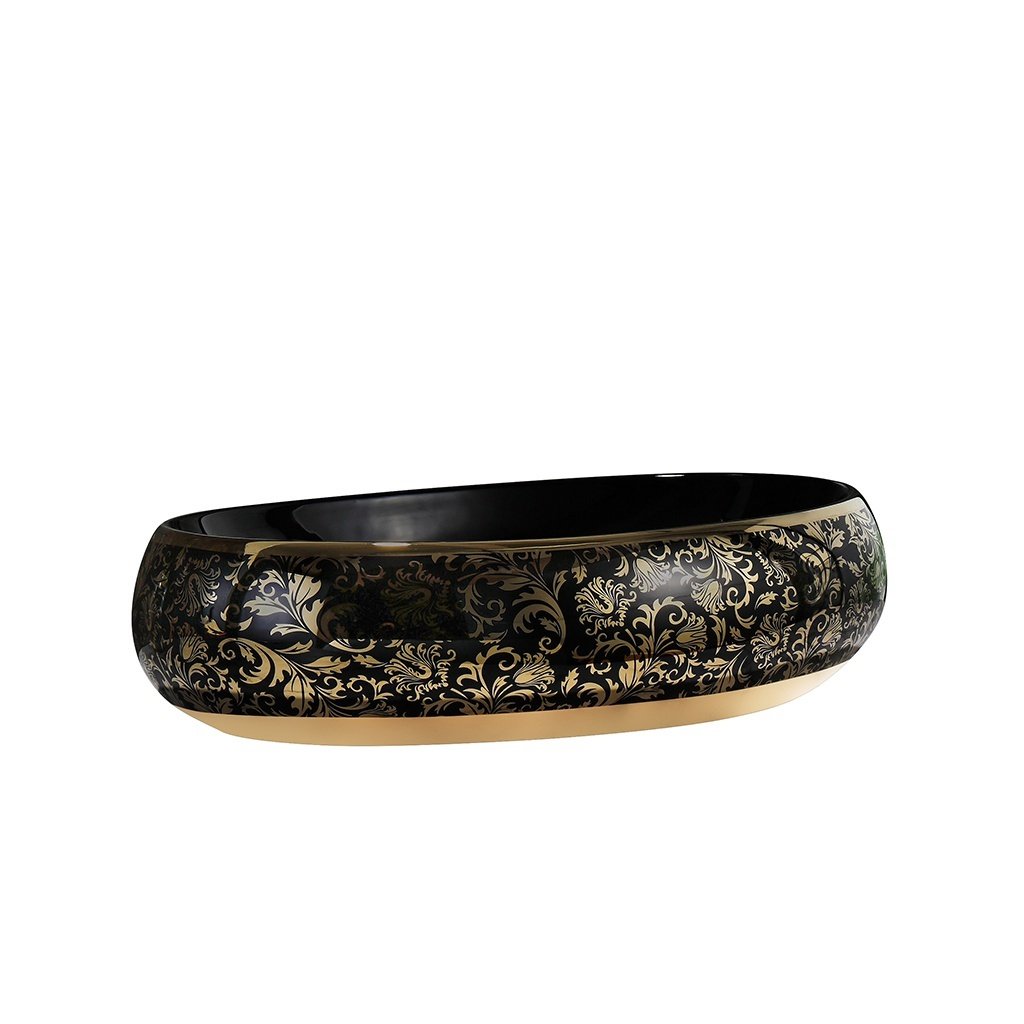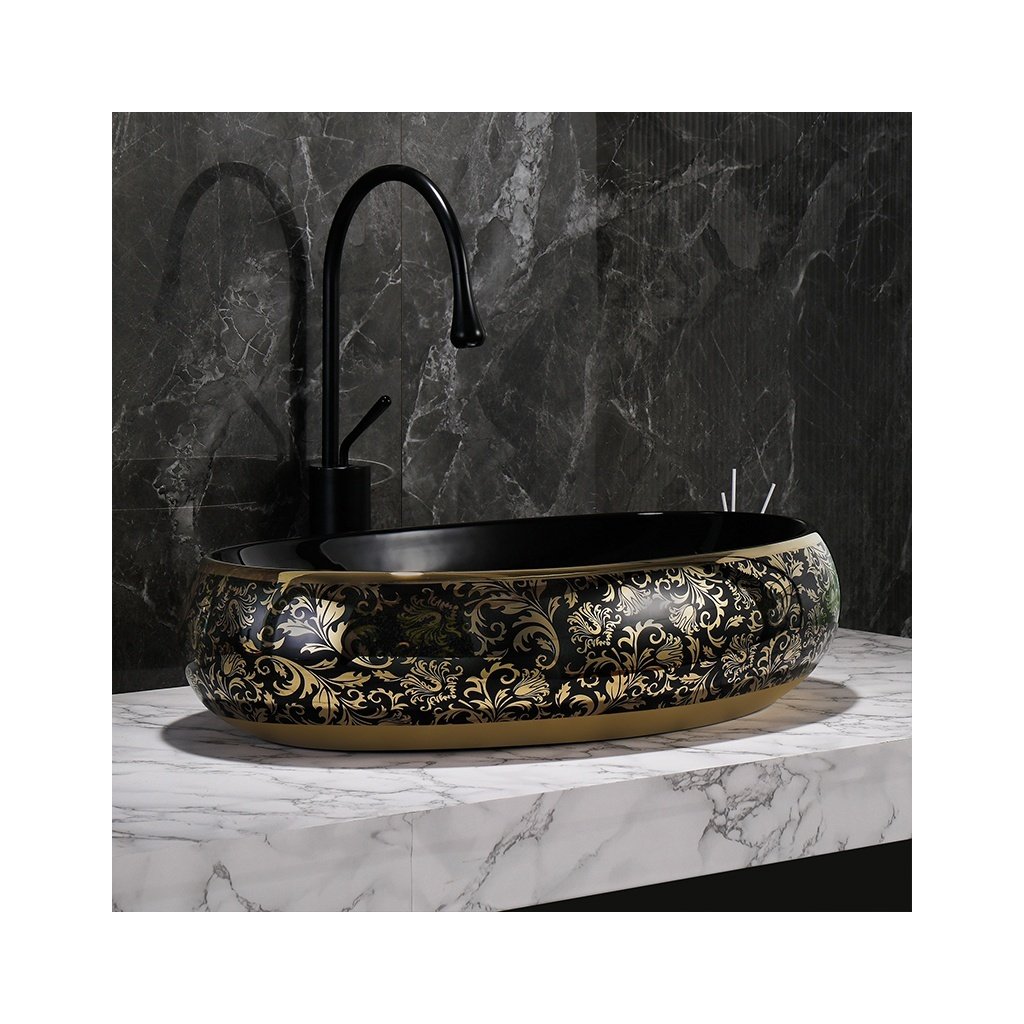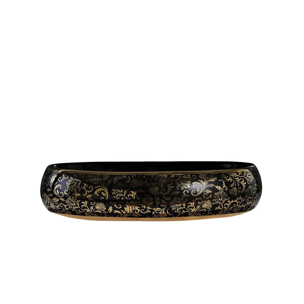 Keramické umyvadlo na desku HYD-CI-BL-GL-MOD4 60x40,5 cm, černá lesk/zlatý dekor
