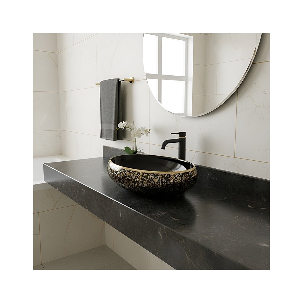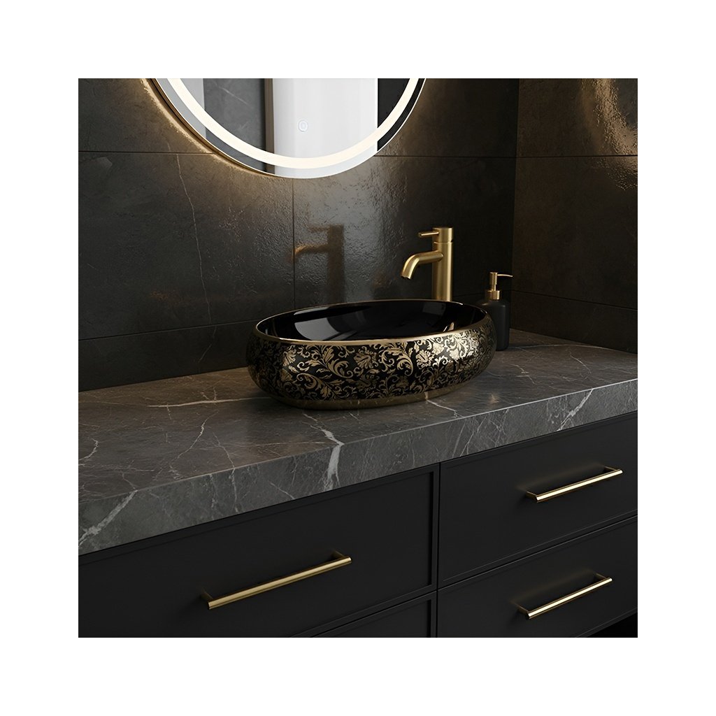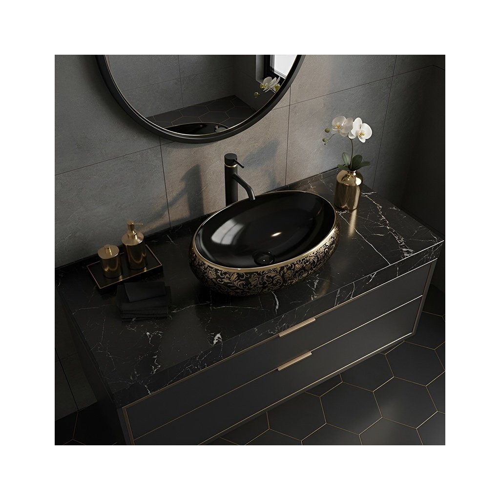 Keramické umyvadlo na desku HYD-CI-BL-GL-MOD4 60x40,5 cm, černá lesk/zlatý dekor