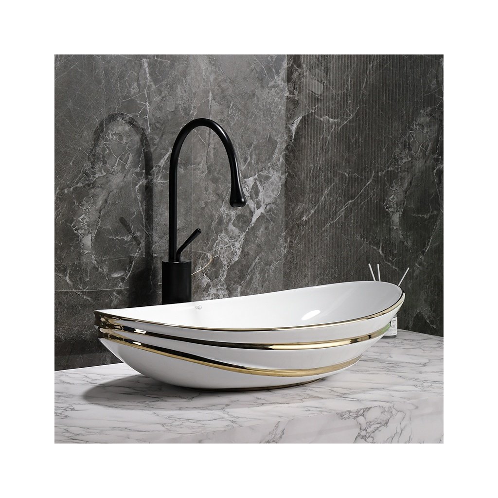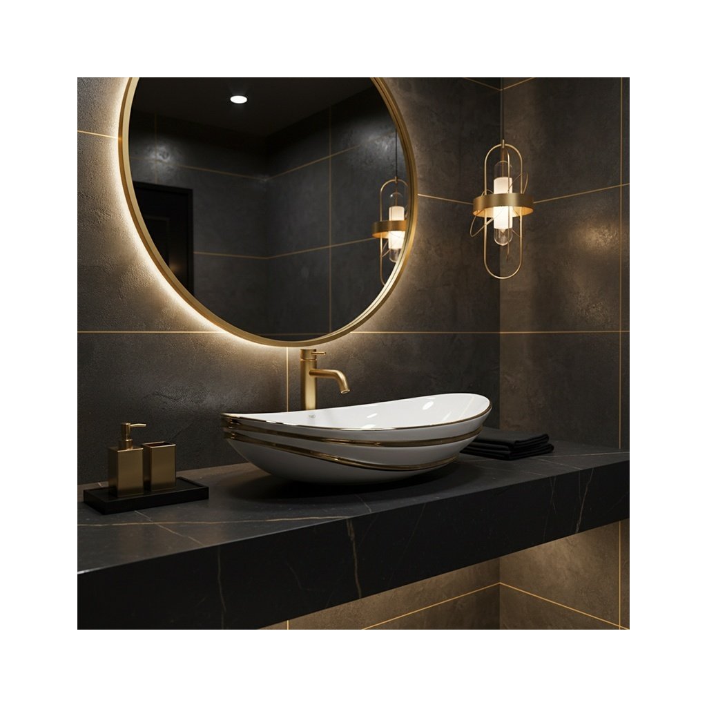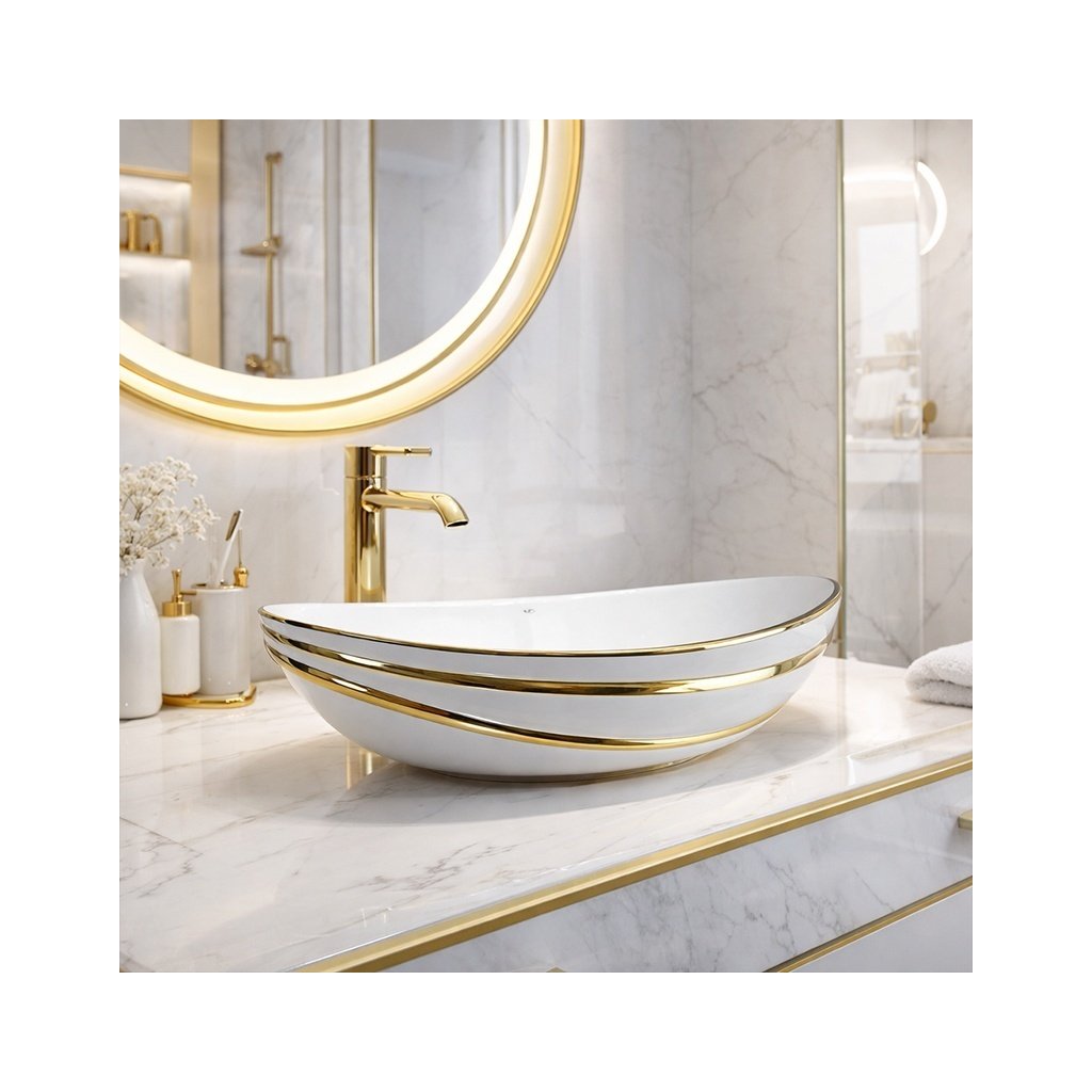 Umyvadlo je vyrobeno z vysokostěnné sanitární keramiky, která se vyznačuje vysokou odolností proti mechanickému poškození a dlouhou životností. Moderní oválný tvar se zaoblenými hranami je podtržen zlatým lemováním, díky čemuž se umyvadlo stává výrazným estetickým prvkem, který se skvěle hodí do interiérů ve stylu modern glamour i klasických koupelen.