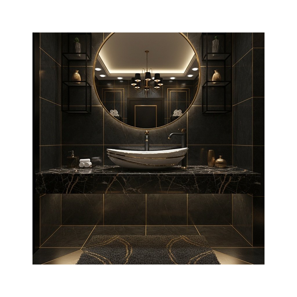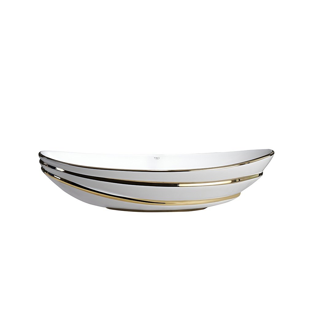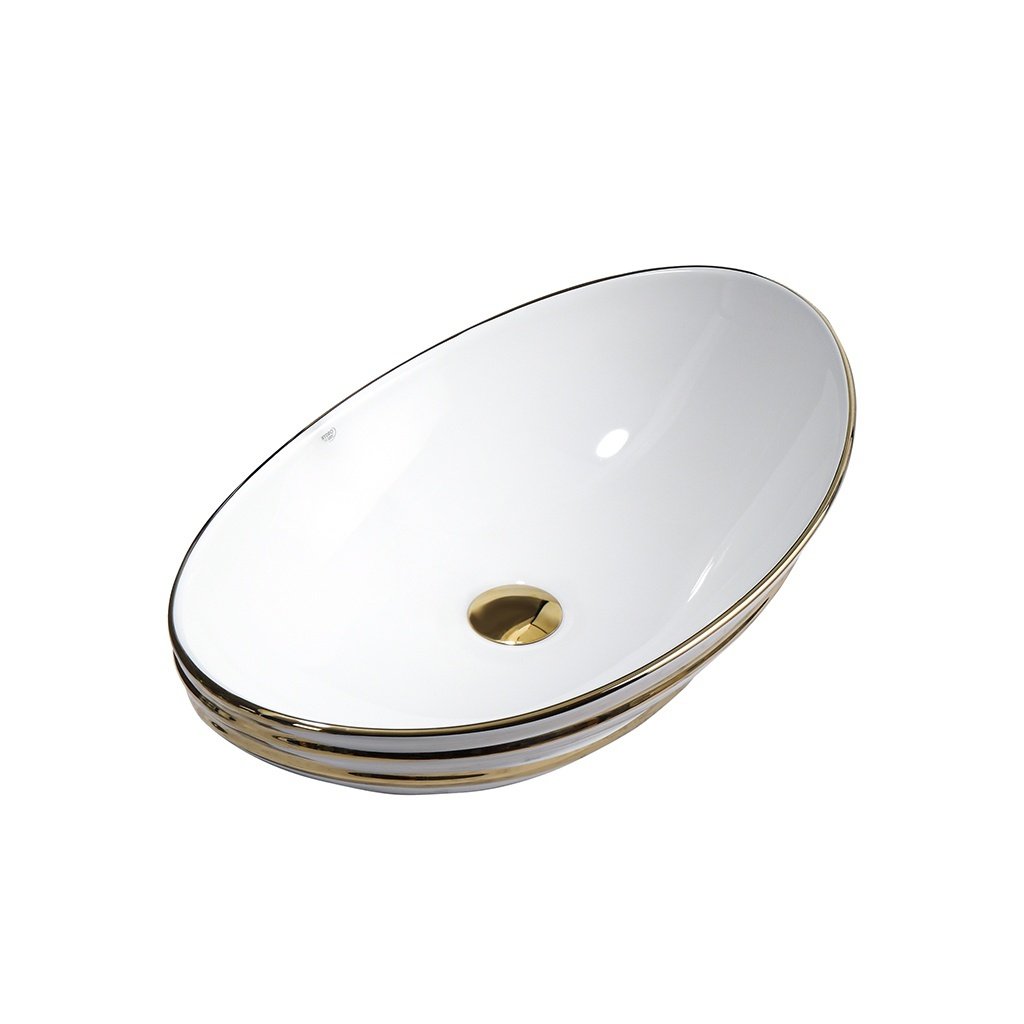 Umyvadlo je vyrobeno z vysokostěnné sanitární keramiky, která se vyznačuje vysokou odolností proti mechanickému poškození a dlouhou životností. Moderní oválný tvar se zaoblenými hranami je podtržen zlatým lemováním, díky čemuž se umyvadlo stává výrazným estetickým prvkem, který se skvěle hodí do interiérů ve stylu modern glamour i klasických koupelen.