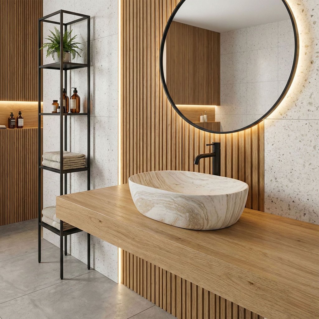 Ačkoliv umyvadlo vypadá jako tesané z kamene, je vyrobeno z prvotřídní sanitární keramiky. To je obrovská výhoda – materiál je extrémně pevný, odolný proti poškrábání a na rozdíl od některých přírodních kamenů nenasakuje a snadno se čistí. Matné provedení je nejen elegantní, ale i vysoce praktické, protože minimalizuje viditelnost zaschlých kapek vody a otisků.