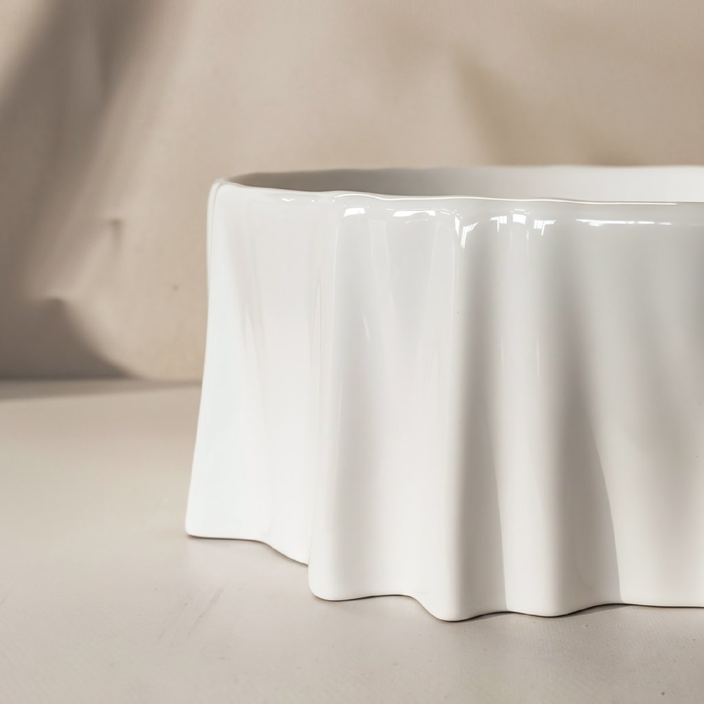 Hlavní předností tohoto modelu je jeho asymetrická forma. Nepravidelná, zvlněná linie okrajů dodává míse organický a unikátní vzhled, který se výrazně odlišuje od standardních geometrických tvarů. Lesklá plocha je navíc zdobena nepravidelným vzorem imitujícím strukturu kamene, což dodává celku hloubku a charakter.