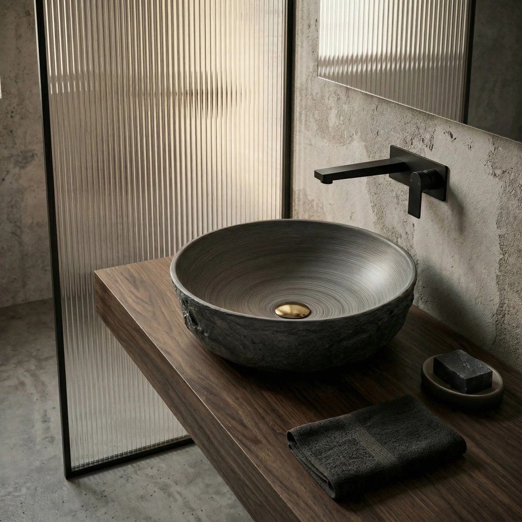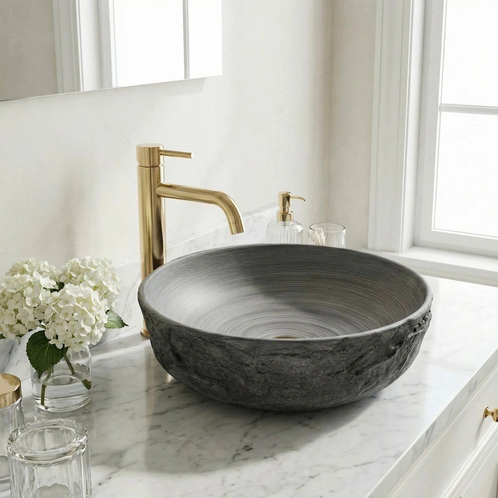 Nejvýraznějším prvkem umyvadla je jeho vnější struktura skály. Výrazná, hrubá textura v matném provedení věrně připomíná přírodní kámen a dodává celému tělesu autentický vzhled. Fascinujícím detailem je pak unikátní vnitřek mísy, který zdobí prostorový koncentrický vzor. Tento prvek vytváří úžasný vizuální efekt při každém kontaktu s vodou a krásně kontrastuje s nepravidelným vnějším pláštěm. Hluboký matný odstín šedé dodává umyvadlu moderní loftový charakter a tvoří dokonalé pozadí pro výraznou armaturu.