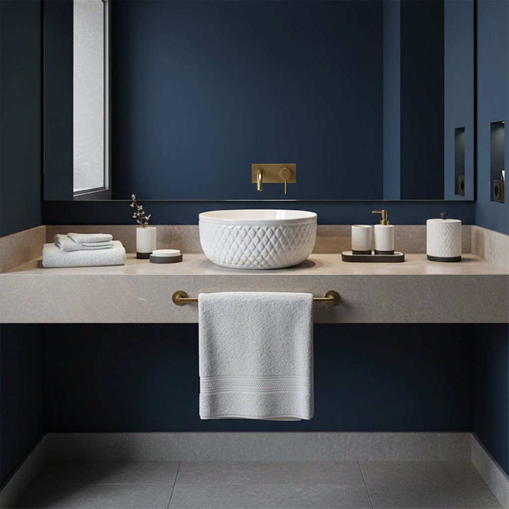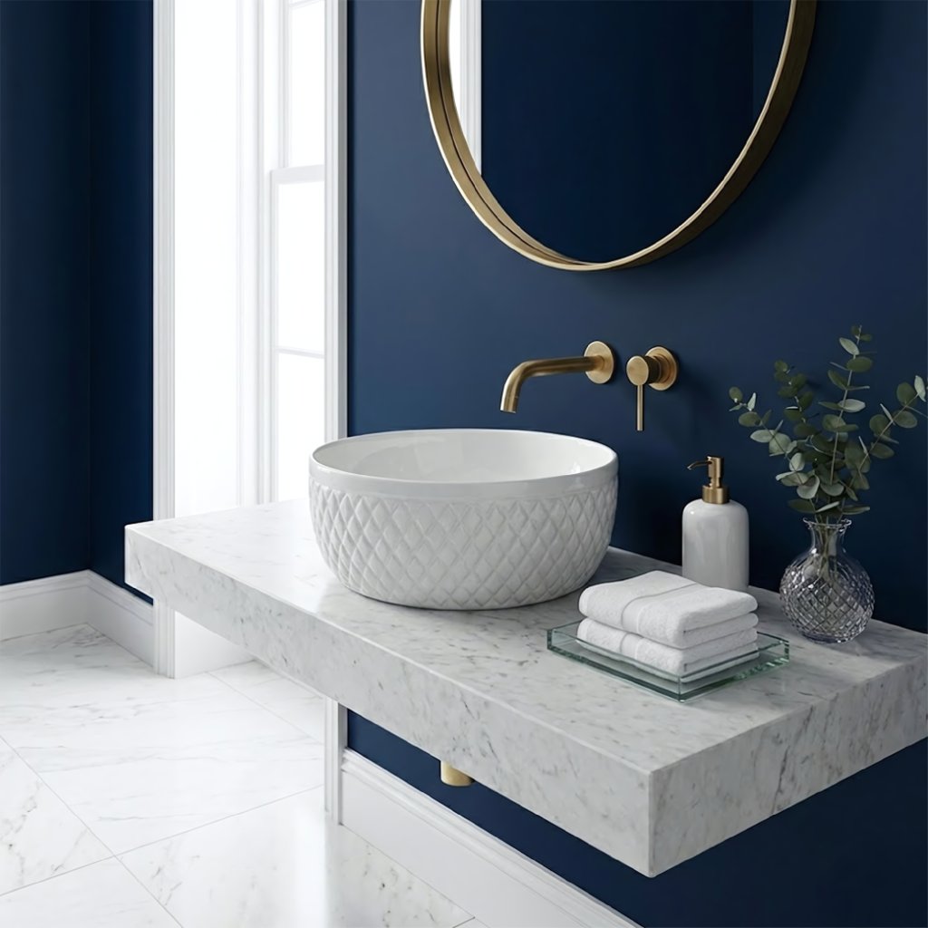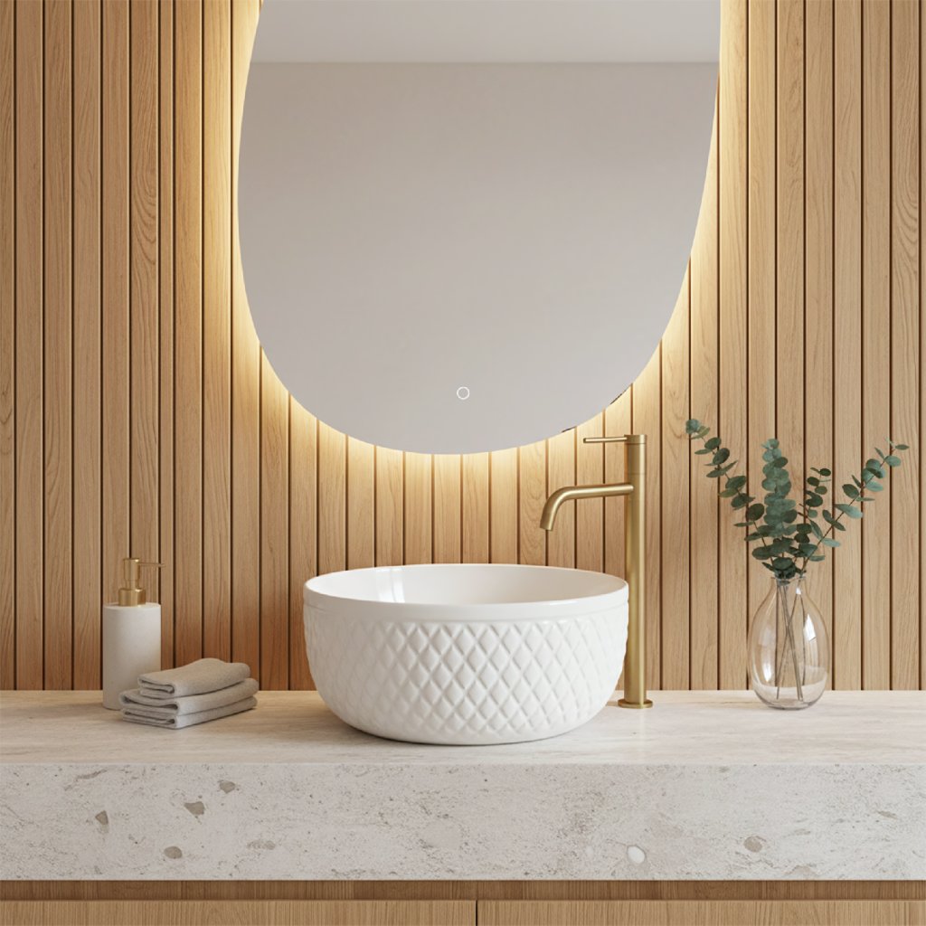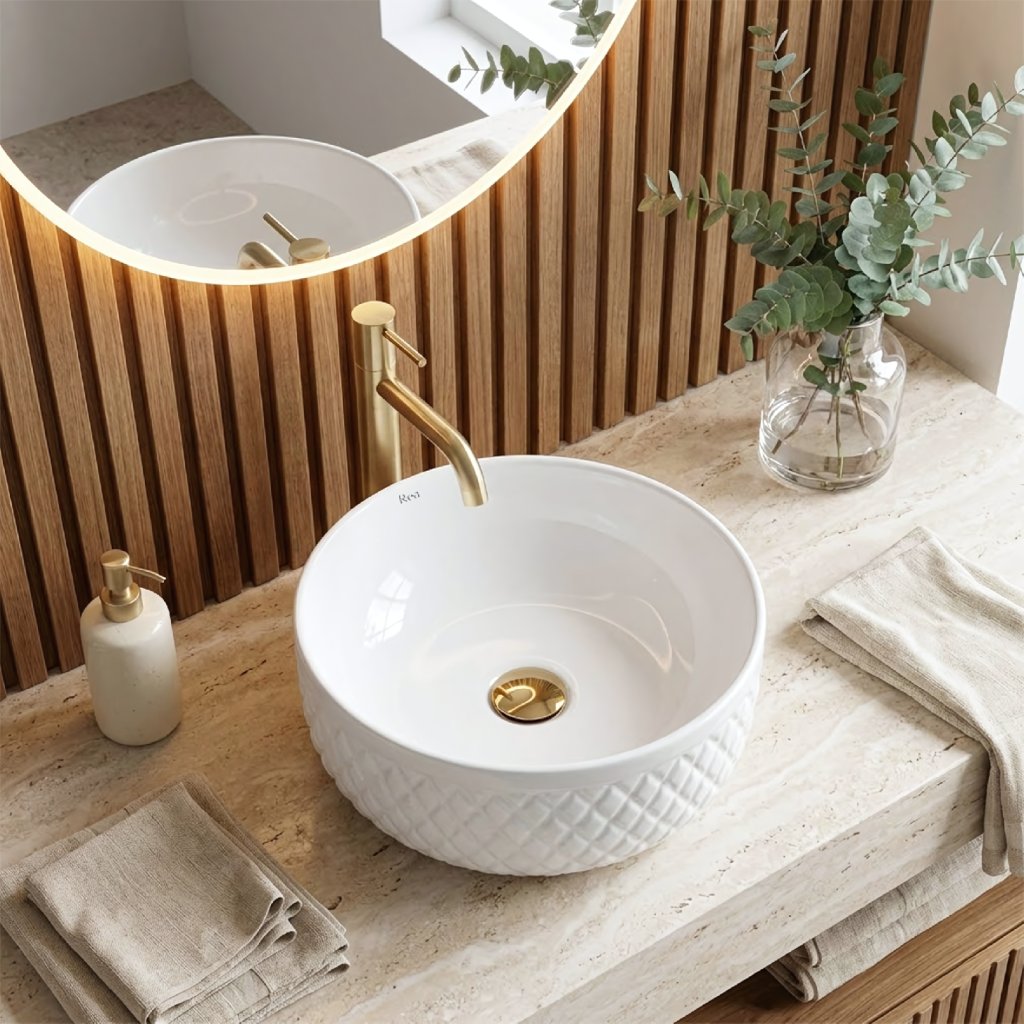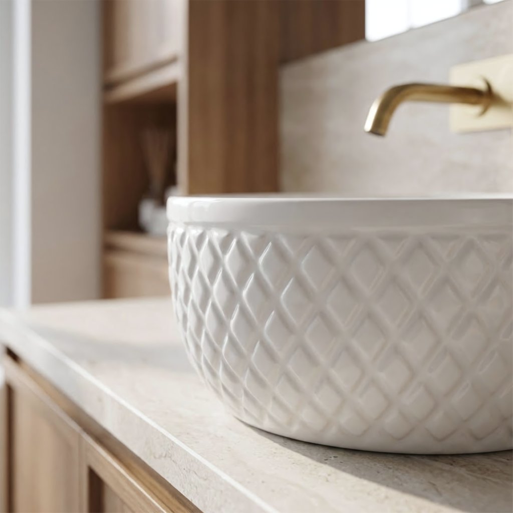Vnější stěny umyvadla zdobí výrazná rýhovaná struktura ve tvaru kosočtverců. Tento geometrický reliéf připomíná luxusní prošívání a vytváří na povrchu efektní hru světla. Díky tomu působí umyvadlo plasticky a skvěle se hodí do interiérů ve stylu Glamour či moderní klasiky.
