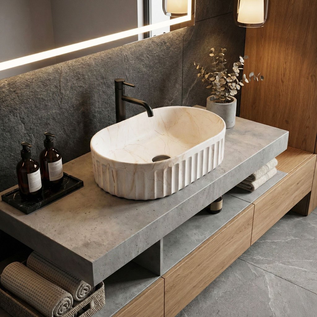 Nejvýraznějším prvkem tohoto umyvadla je jeho vnější plášť, který zdobí svislé drážky (rýhování). Tento vysoce aktuální designový detail efektivně narušuje sterilitu hladkých ploch, opticky odlehčuje celý tvar a vytváří rafinovanou hru světla a stínu. Skvěle se tak doplňuje s dalšími rýhovanými prvky v interiéru, například s moderními čely koupelnového nábytku či texturovanými obklady.