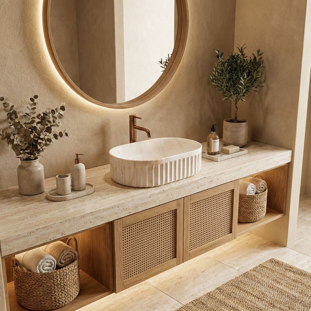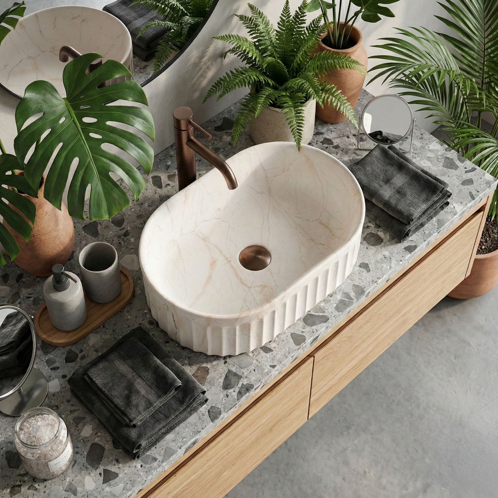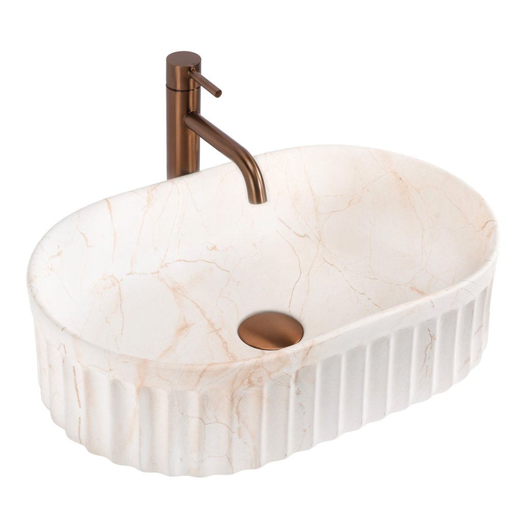 Vnitřní i vnější část umyvadla zaujme elegantním béžovým vzorem, který imituje přírodní mramor s velmi jemným, decentně rezavým žilkováním. Tento matný povrch nejenže vypadá mimořádně esteticky a hřejivě, ale je také velmi praktický pro každodenní používání – účinně maskuje drobné kapky vody a velmi snadno se udržuje v čistotě.