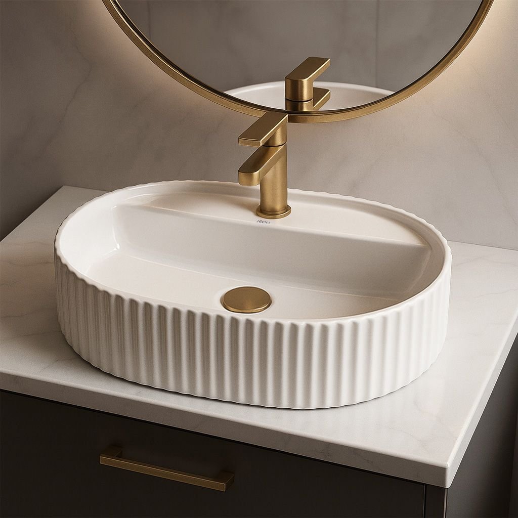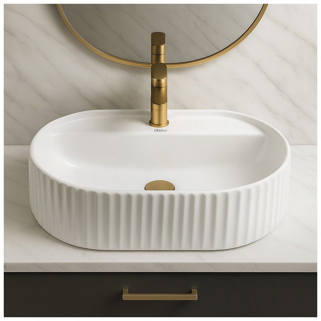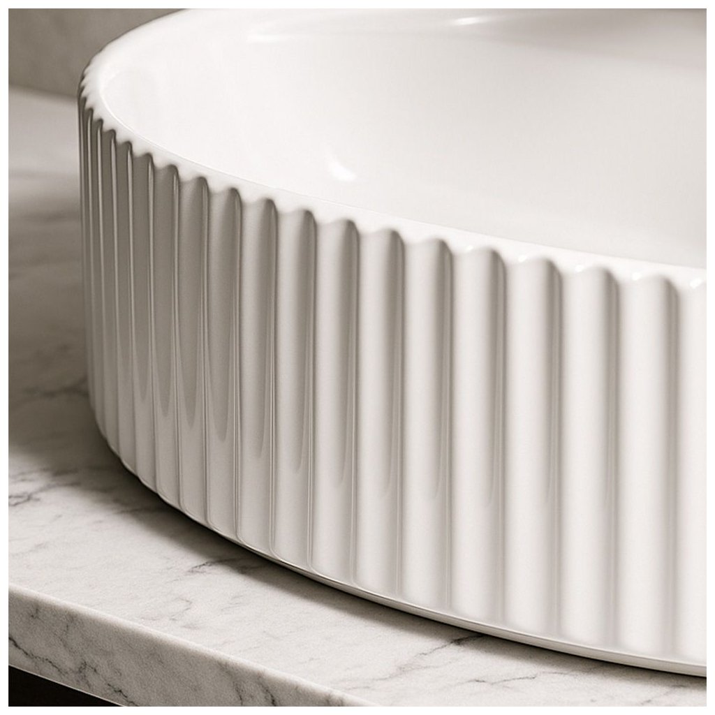 Jeho oválný tvar s dekorativními svislými drážkami na vnějších stěnách dodává interiéru jedinečný charakter a jemnou strukturu, která podtrhuje styl uspořádání. Model je vhodný k montáži na desku nebo koupelnovou skříňku, což umožňuje volnost uspořádání prostoru.
