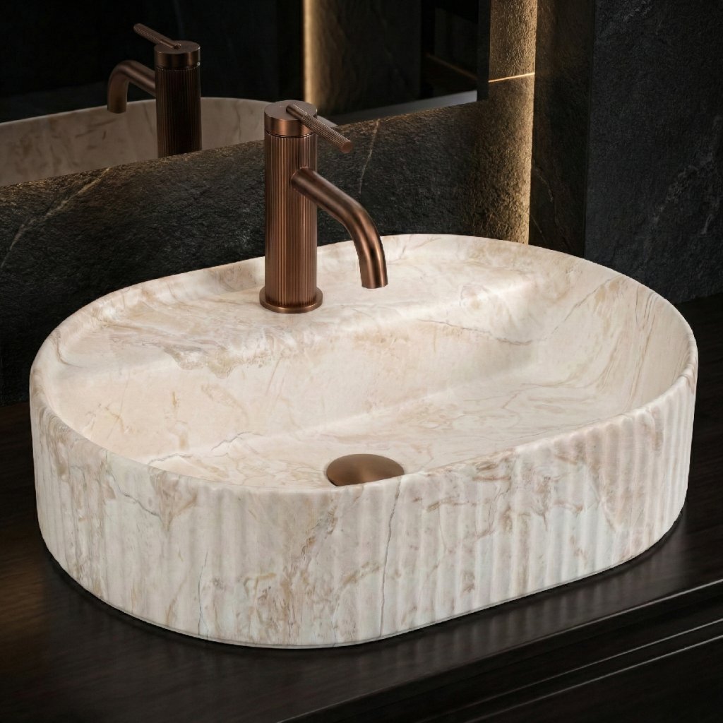 Dominantou umyvadla je výrazná vroubkovaná struktura na vnější stěně, tvořená svislými žlábky, které podtrhují jeho designerský původ. Povrchová úprava Saturn je inspirována přírodním kamenem – světlá mramorová struktura s decentními žilkami v teplých pískových tónech vytváří klidné a luxusní pozadí, které skvěle vynikne v kombinaci s bateriemi v barvě mědi, zlata nebo černé. Matný povrch zdůrazňuje ušlechtilý charakter keramiky a působí velmi elegantně na světlých i tmavých deskách.