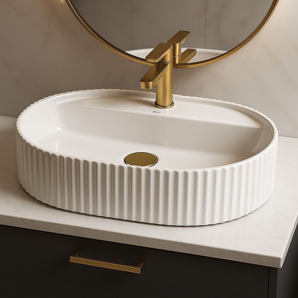 Jeho oválný tvar s dekorativními svislými drážkami na vnějších stěnách dodává interiéru jedinečný charakter a jemnou strukturu, která podtrhuje styl uspořádání. Model je vhodný k montáži na desku nebo koupelnovou skříňku, což umožňuje volnost uspořádání prostoru.