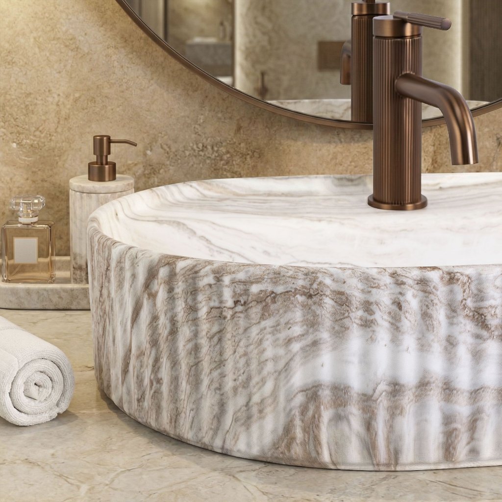 Hledáte stylové umyvadlo, které se stane ústředním bodem vaší koupelny? Keramické umyvadlo na desku Marcela 60 v béžovém matu s unikátním vzorem imitujícím přírodní kámen je ideální volbou. Spojení moderní formy se syrovou elegancí dodá každému interiéru neopakovatelný charakter a punc luxusu, který odolá měnícím se trendům.