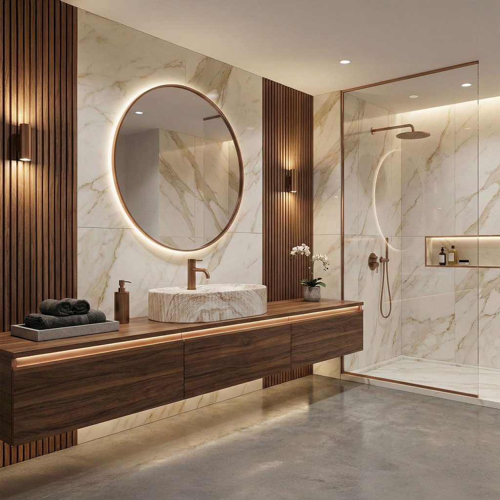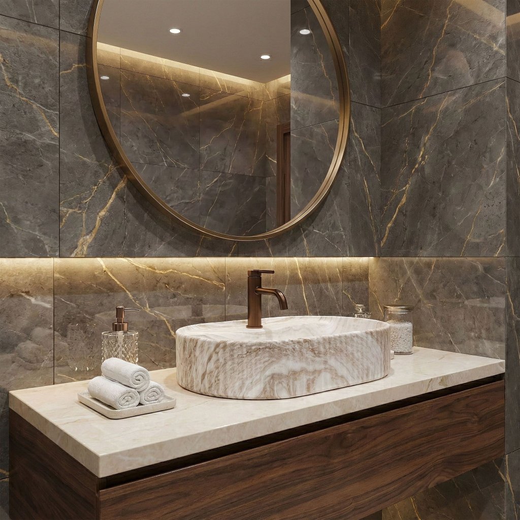 - Design imitující kámen: přirozená elegance v teplém béžovém tónu