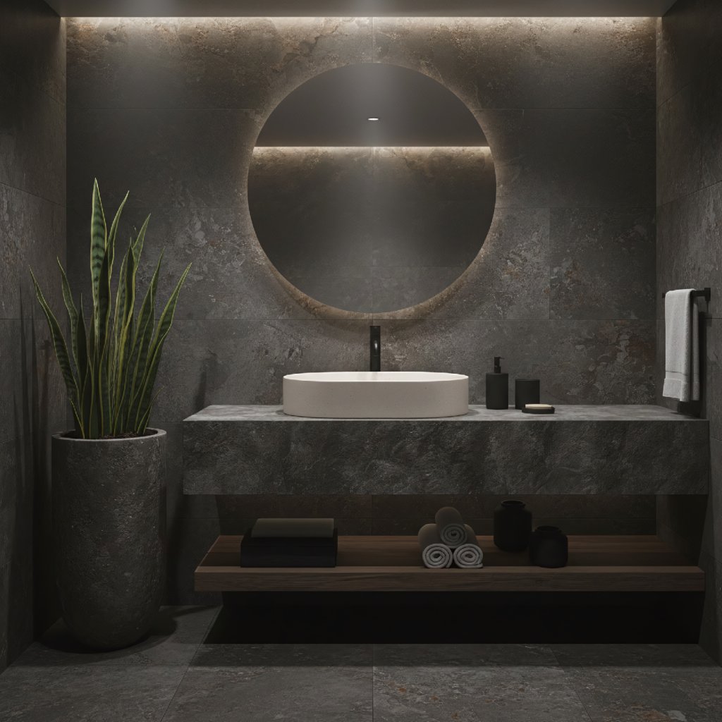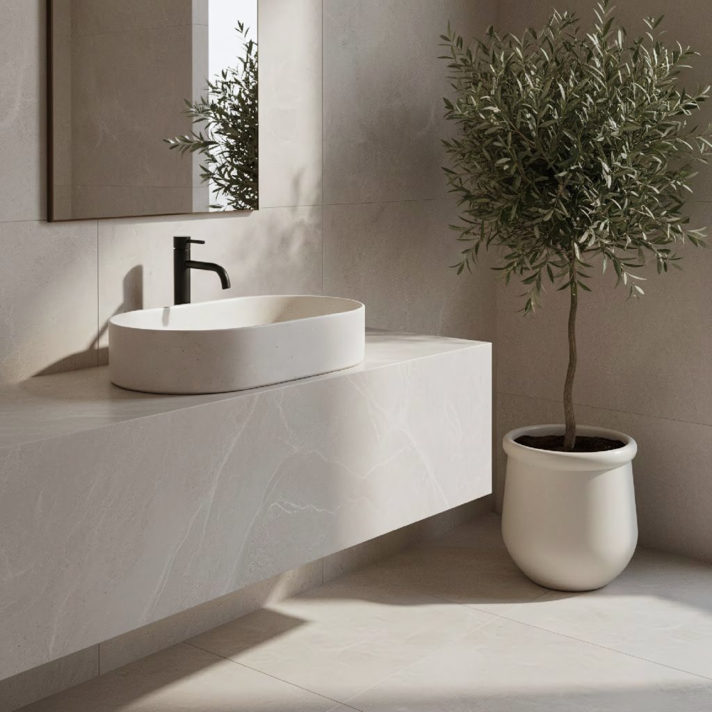 - Přírodní vzhled: Unikátní vzor s efektem pískovce dodává koupelně organický nádech.