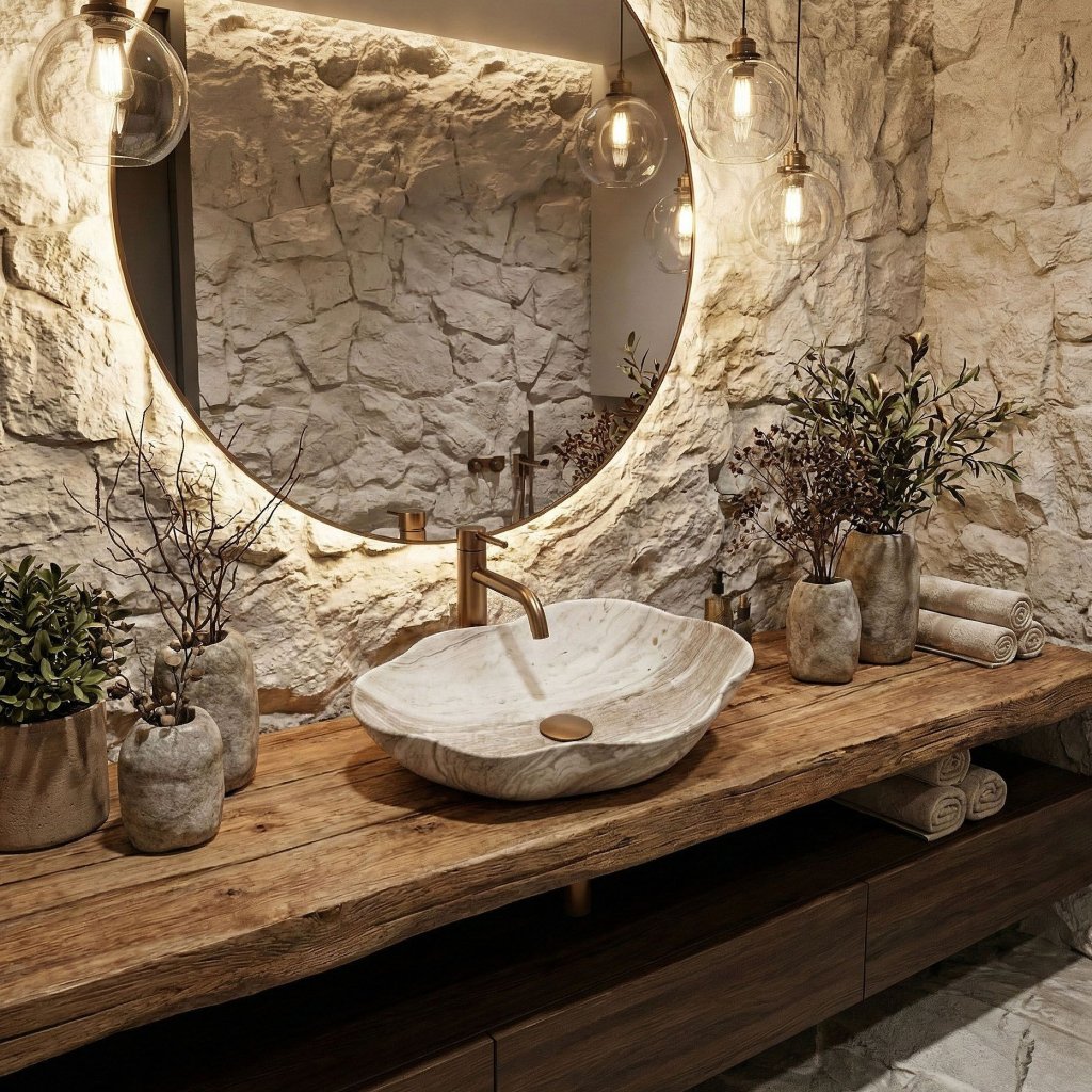 Ačkoliv umyvadlo vizuálně působí jako vytesané z kamene, je vyrobeno z vysoce kvalitní sanitární keramiky. Tento materiál zaručuje dlouhou trvanlivost, vysokou odolnost proti poškrábání a především snadné čištění. I přes svůj dekorativní matný povrch tak umyvadlo splňuje vysoké nároky na hygienu a údržbu. Povrchová úprava vnáší do interiéru eleganci a pocit luxusu.