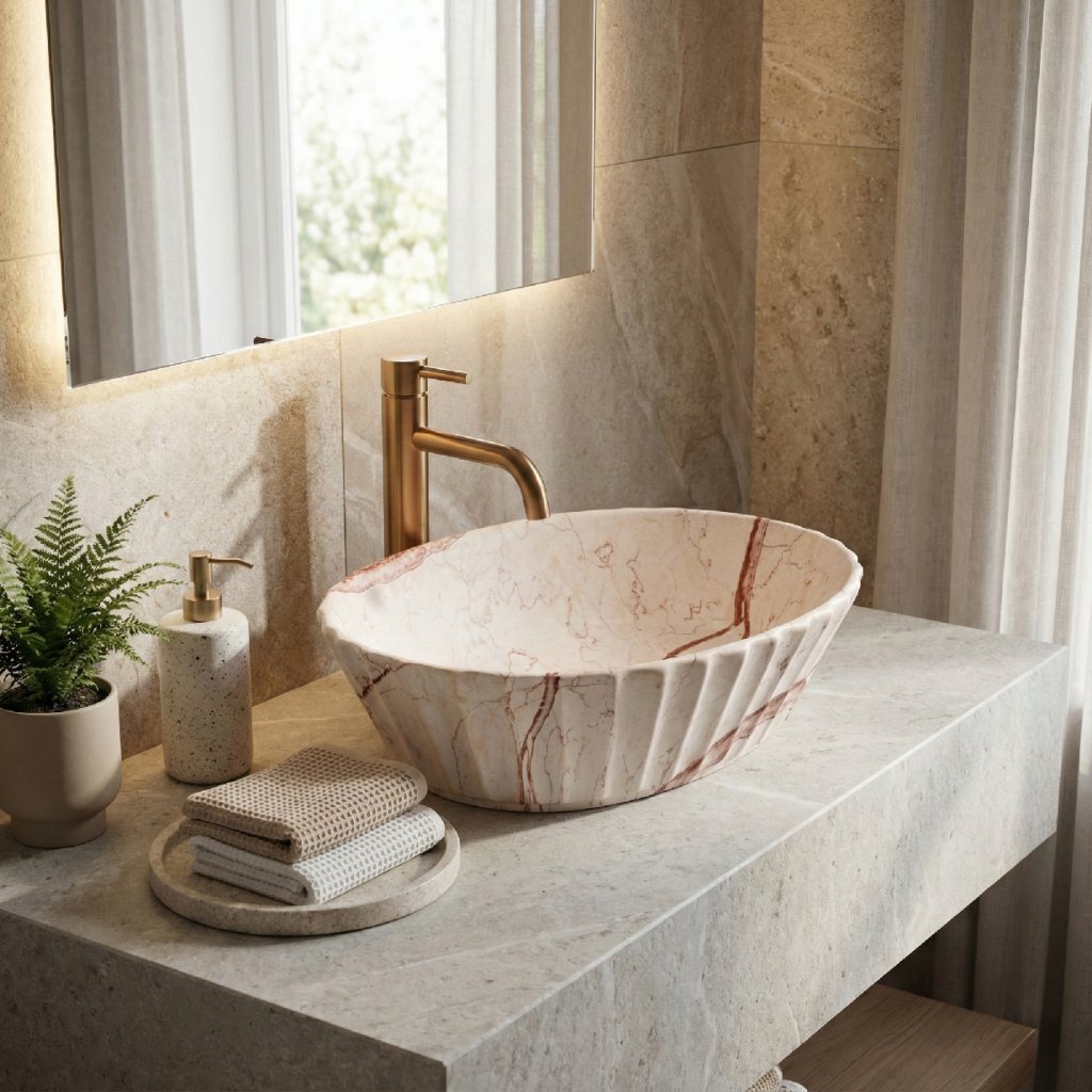 Dominantou umyvadla je decentní vroubkovaná struktura na vnějších stěnách, která dodává tělesu hloubku a architektonický rytmus. Povrch je vyveden v unikátním vzoru inspirovaném přírodním kamenem – teplé mramorové žilkování v odstínech béžové a karmelu vytváří hřejivou atmosféru. Tato barevná kombinace se skvěle doplňuje s dřevěnými deskami, světlým nábytkem i kontrastními tmavými prvky, čímž do koupelny vnáší organický klid a pocit luxusu.