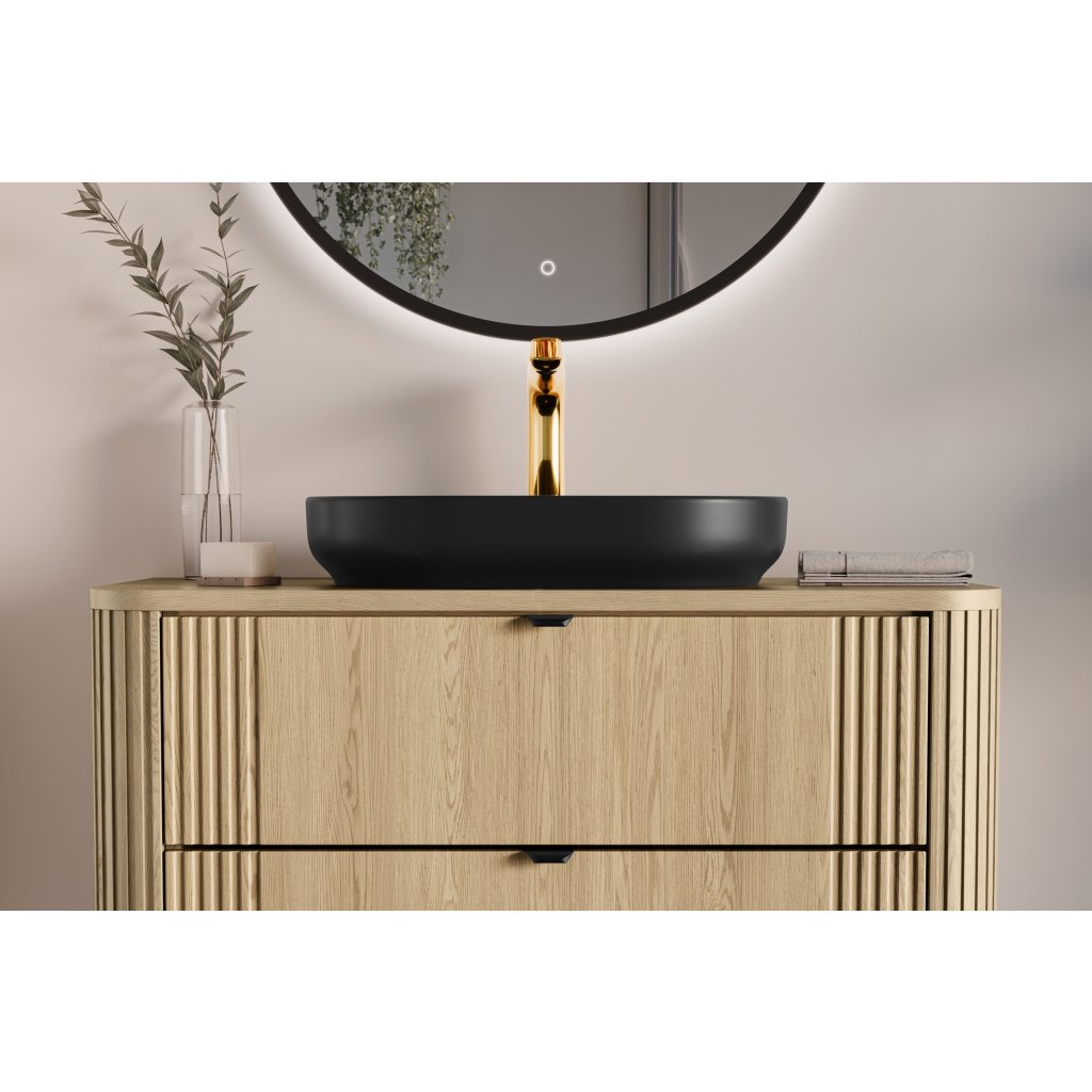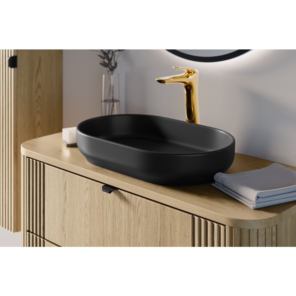 Oválné umyvadlo RIVER 2 navazuje na tyto vlastnosti a kombinuje je s moderním designem. Je vyrobeno z vysoce kvalitní sanitární keramiky a má matnou černou povrchovou úpravu, která dodá interiéru elegantní a nadčasový kontrast. Umyvadlo je bez otvoru pro baterii a je bez přepadu.