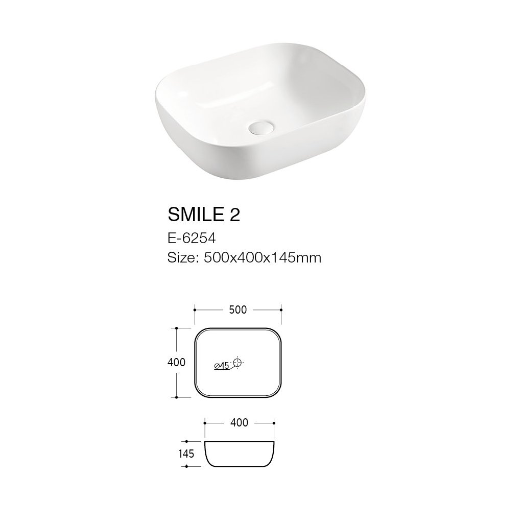 Pravoúhlé umyvadlo SMILE navazuje na tyto vlastnosti a kombinuje je s čistými, elegantními liniemi. Je vyrobeno z vysoce kvalitní sanitární keramiky a má hladký povrch ve vysokém bílém lesku. Umyvadlo je navrženo bez otvoru pro baterii a je bez přepadu.