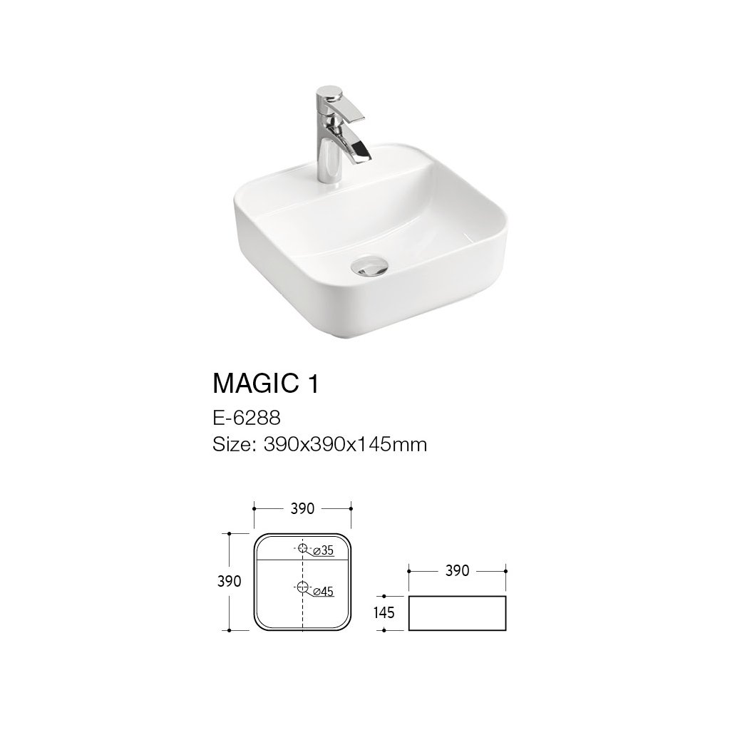 Kompaktní čtvercové umyvadlo MAGIC 40 navazuje na tyto vlastnosti a kombinuje je s vysokou praktičností. Je vyrobeno z vysoce kvalitní sanitární keramiky a má hladký povrch ve vysokém bílém lesku. Umyvadlo je unikátní tím, že má jeden otvor pro instalaci stojánkové baterie přímo na umyvadle, což zjednodušuje montáž baterie. Umyvadlo je bez přepadu.