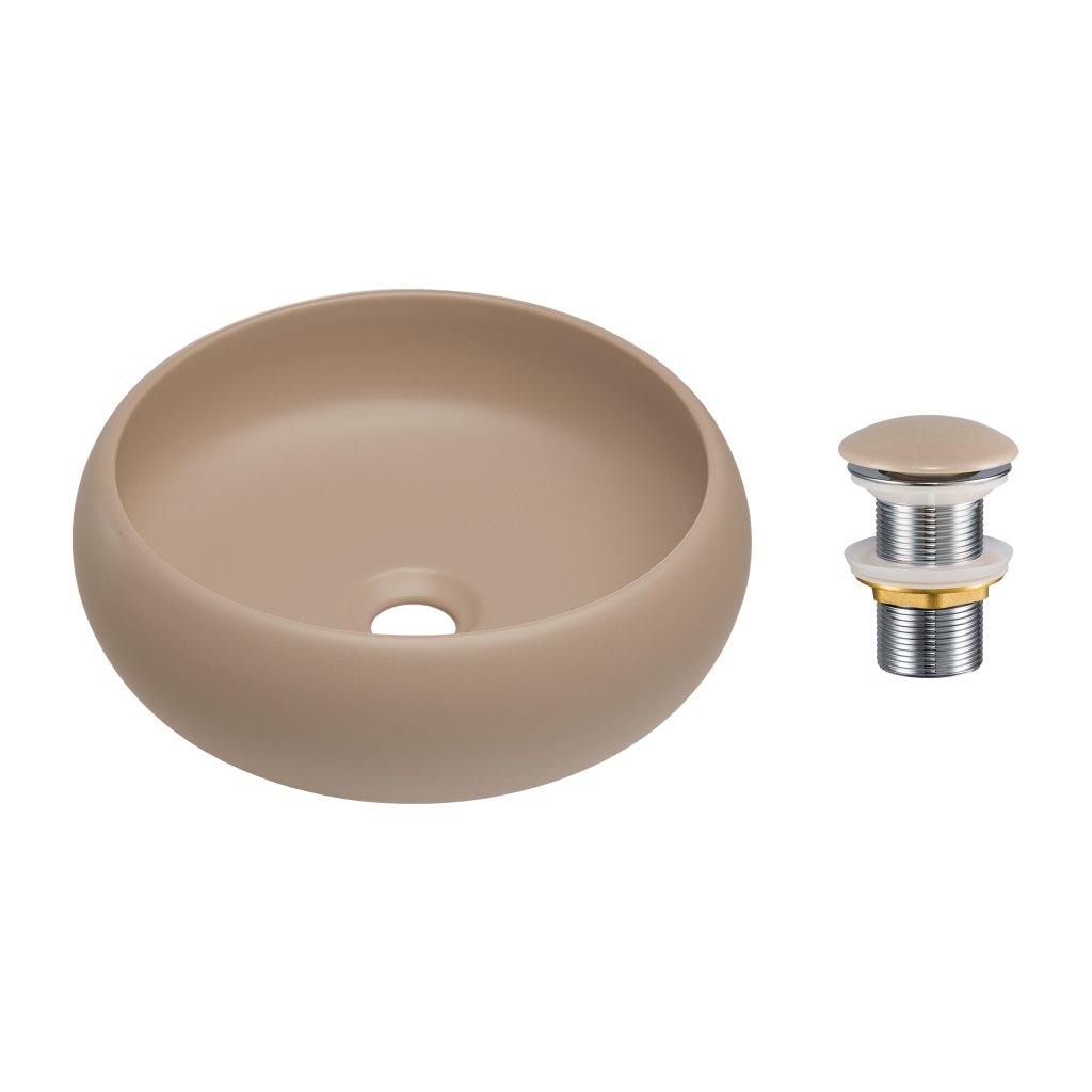 - sestava kulatého umyvadla a ladící výpusti v barvě cappuccino