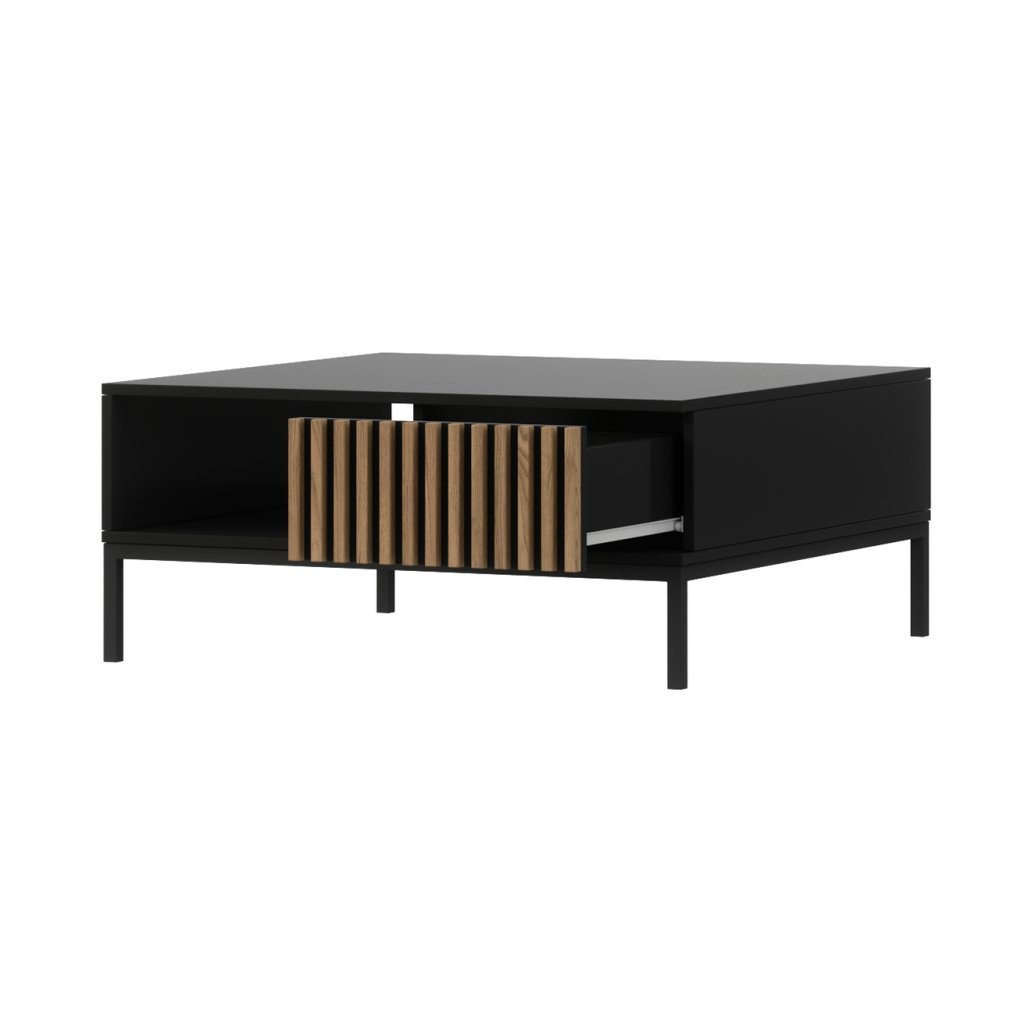 Černý konferenční stolek Meorati je elegantní a funkční kus nábytku, který se skvěle hodí do moderních interiérů. Jeho pevná konstrukce zajišťuje nejen estetický vzhled, ale také odolnost a pohodlné používání. Stolek má rozměry, díky kterým se skvěle hodí do většiny prostor.Jeho hloubka je 80 cm, šířka rovněž 80 cm a výška 35 cm. Nohy jsou vysoké 20 cm, což zajišťuje stabilitu a vyváženost nábytku. Výrobek je vyroben z vysoce kvalitní desky o tloušťce 16 mm. Tento materiál je odolný a snadno se udržuje v čistotě. Navíc ABS hrany na zásuvkách a korpusu stolu zajišťují ochranu proti mechanickému poškození a podtrhují estetiku nábytku.