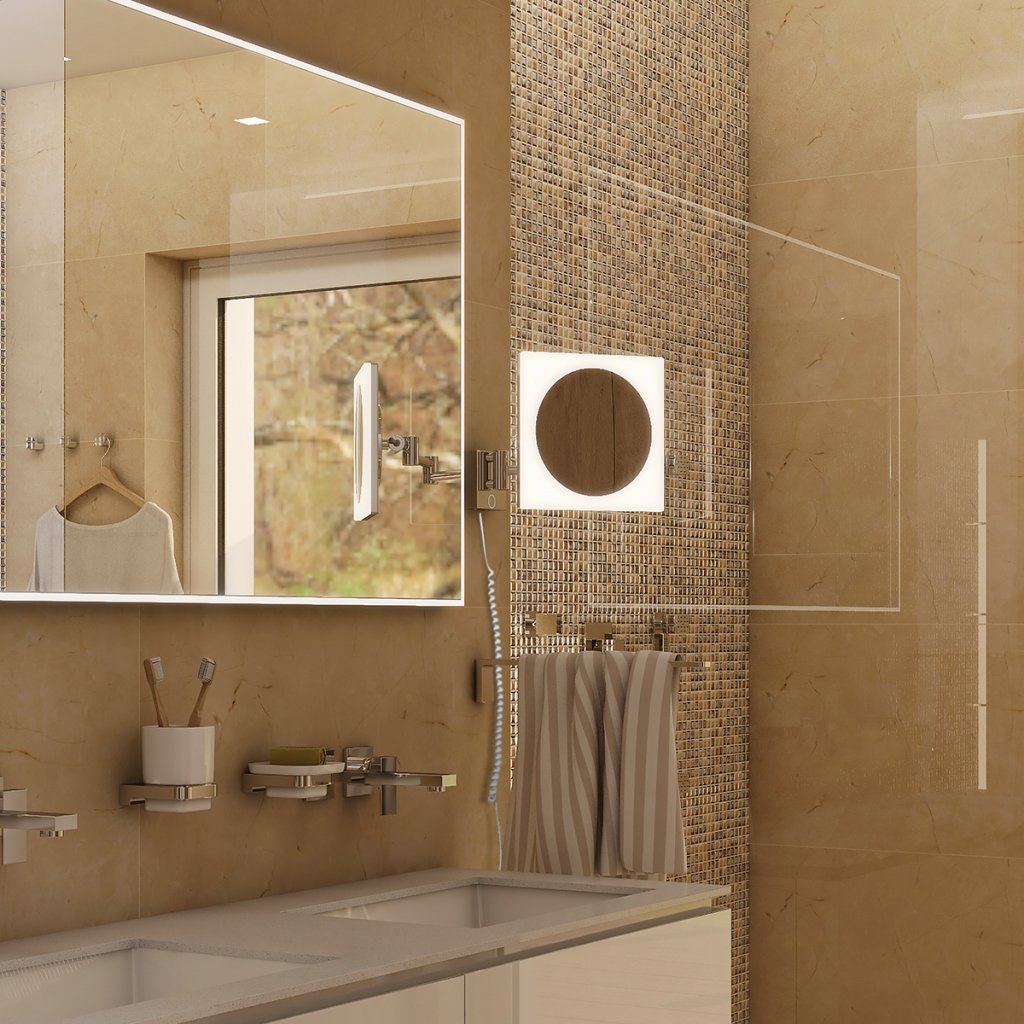 Nástěnné kosmetické podsvícené zvětšovací zrcadlo je skvělým doplňkem do koupelny. Vaše péče o pleť a dokonalé líčení bude pohodlnější a příjemnější s LED kosmetickým zrcátkem NIMCO, podsvíceným celém po obvodu. Výkonné LED diody jsou chráněny bílým plexiglass, které světlo souměrně rozptyluje, zjemňuje a umí krásně osvětlit obličej.Kromě svícení zrcátko také zvětšuje a je tak skvělým pomocníkem při celkové péči o pleť, čímž ho v domácnosti ocení nejen ženy toužící po dokonalosti. Není třeba to se zvětšením přehánět. Pětinásobné zvětšení je pro péči o pleť tak akorát. Zákazníci často hledají kosmetické zrcátko se zvětšením 10x i více. My věříme tomu, že tolik není potřeba. 10x zvětšení zrcadla pro make-up už je opravdu hodně a může být až nepříjemné. Proto Nimco doporučuje a nabízí zvětšení 5x a u některých zrcadel dokonce jen 3x.