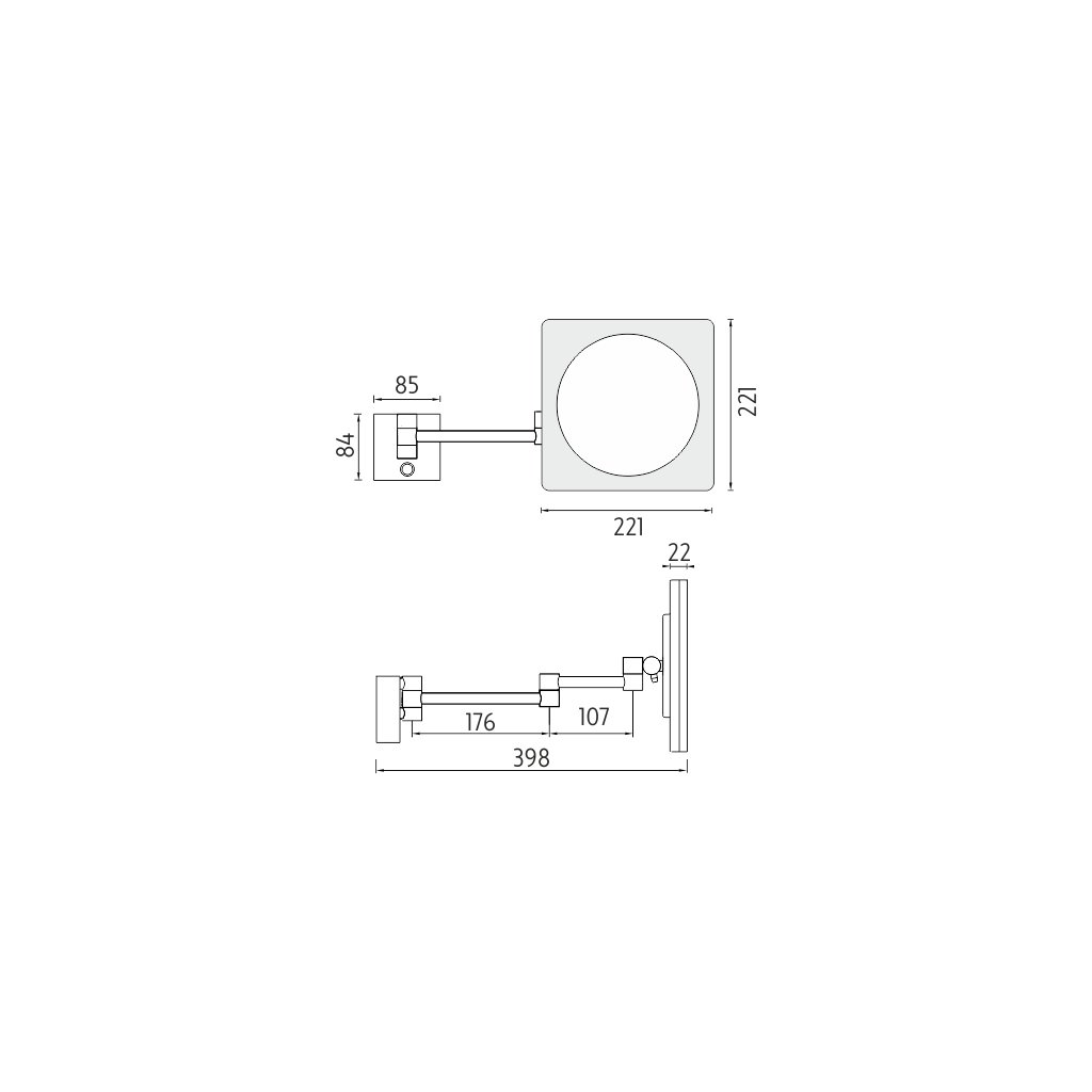 Použité LED čipy o vysokém výkonu. Barevná teplota zvolena studená bílá. Barevná teplota 6500 K. Dotykový podsvícený spínač. Připojení 220-240V. Ochrana IP 21. Výkon 8 W. LED zrcátko s vypínačem, zapojení ploché vidlice do zásuvky. Délka kabelu bez natažení 56 cm, po vytažení 120 cm. Hloubka zrcadla ve složeném stavu u zdi je 9 cm. Celková šířka zrcadla ve složeném stavu u zdi je 23 cm.