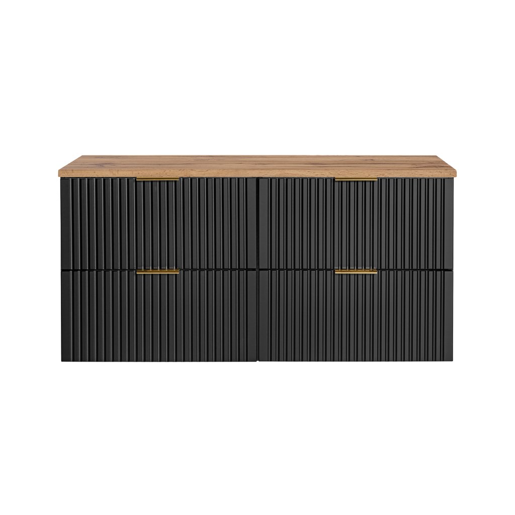 Set Adel Black o šířce 1200 mm přináší do koupelny moderní kontrast, kde se snoubí elegantní černý mat s přírodním dekorem dubu Wotan. Nadčasový design, doplněný o stylová vertikálně rýhovaná čela, je ideální pro ty, kteří hledají sofistikované a zároveň útulné řešení pro svůj interiér. Horní deska v dekoru dub Wotan je perfektní plochou pro instalaci jednoho nebo dvou deskových umyvadel.
