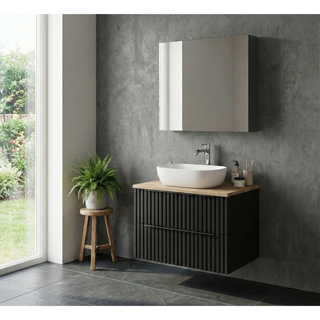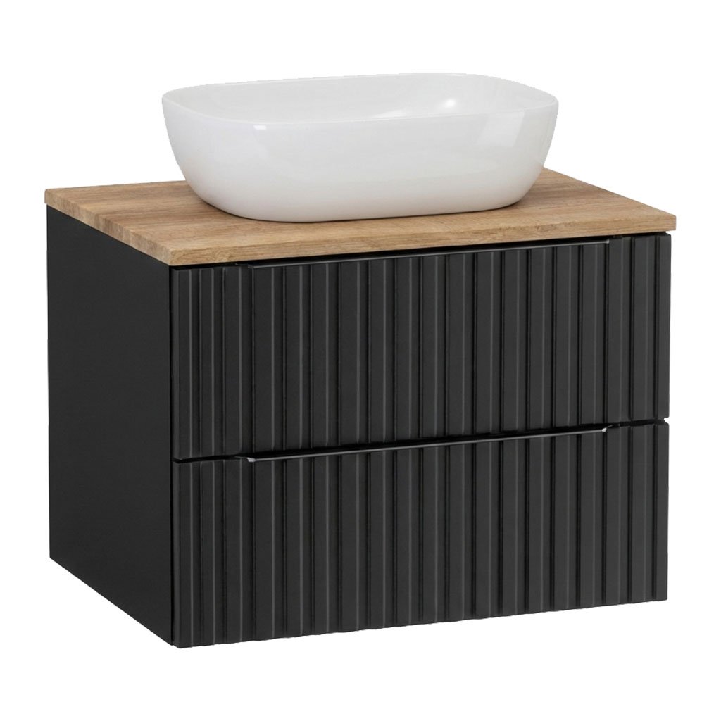 Atraktivní kombinace černého korpusu a profilovaných matných černých fóliovaných čelních ploch. Tento nadčasový design vynikne v každé koupelně. Modelová řada se skládá ze skříňky s keramickým umyvadlem v šířce 60 cm v zásuvkovém provedení doplněné skříňkou vysokou s dostatečně velkým úložným prostorem. V současné době velmi oblíbenou alternativou místo skříňky s umyvadlem je černá skříňka se dvěma zásuvkami s horní deskou v dekoru Dub Country, na kterou lze umístit jakékoliv deskové umyvadlo z naší nabídky. Skříňku s umyvadlem i pod deskové umyvadlo lze pro úplnost doplnit zrcadlovou skříňkou v šířce 60 cm, kterou lze doplnit jakýmkoliv LED osvětlením z naší nabídky.