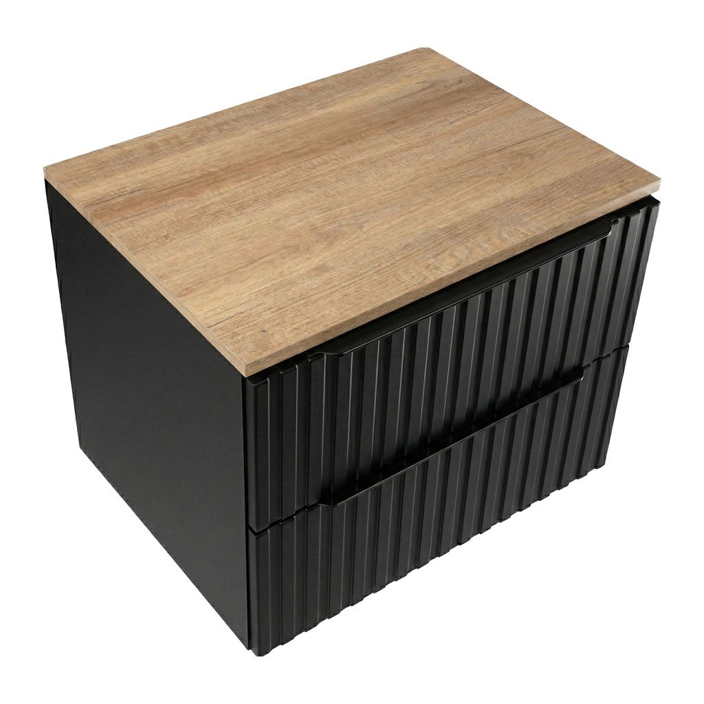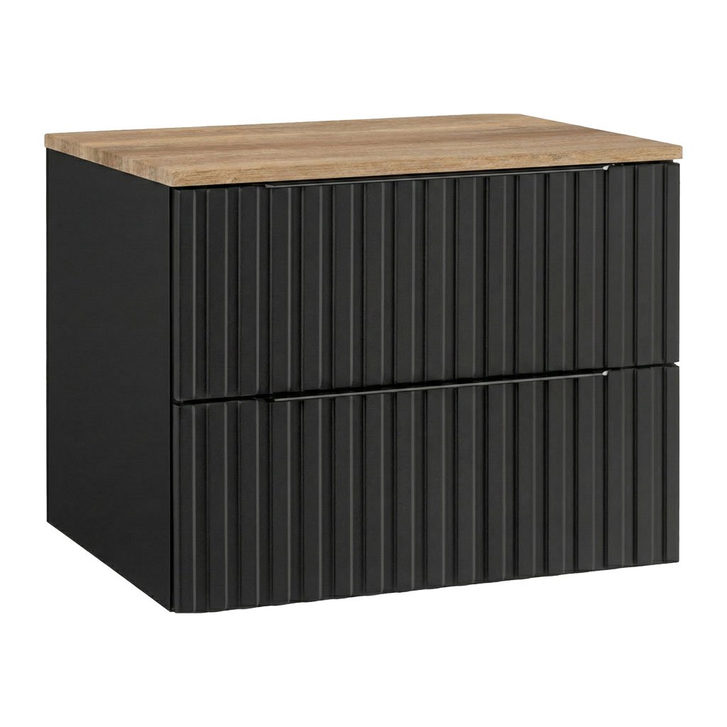 Skříňka pod deskové umyvadlo Amata B 60-HD v provedení se dvěma zásuvkami na pojezdech se systémem tichého dovírání je určena k zavěšení na zeď pomocí rektifikačních závěsů. Horní zásuvka je provedena s výřezem pro umístění odpadového sifonu. Profilované čela zásuvek jsou pro snadné otevírání doplněné kovovými, černými madly. Součástí skříňky je horní deska v dekoru Dub Country na kterou lze instalovat jakékoliv deskové umyvadlo z naší nabídky.