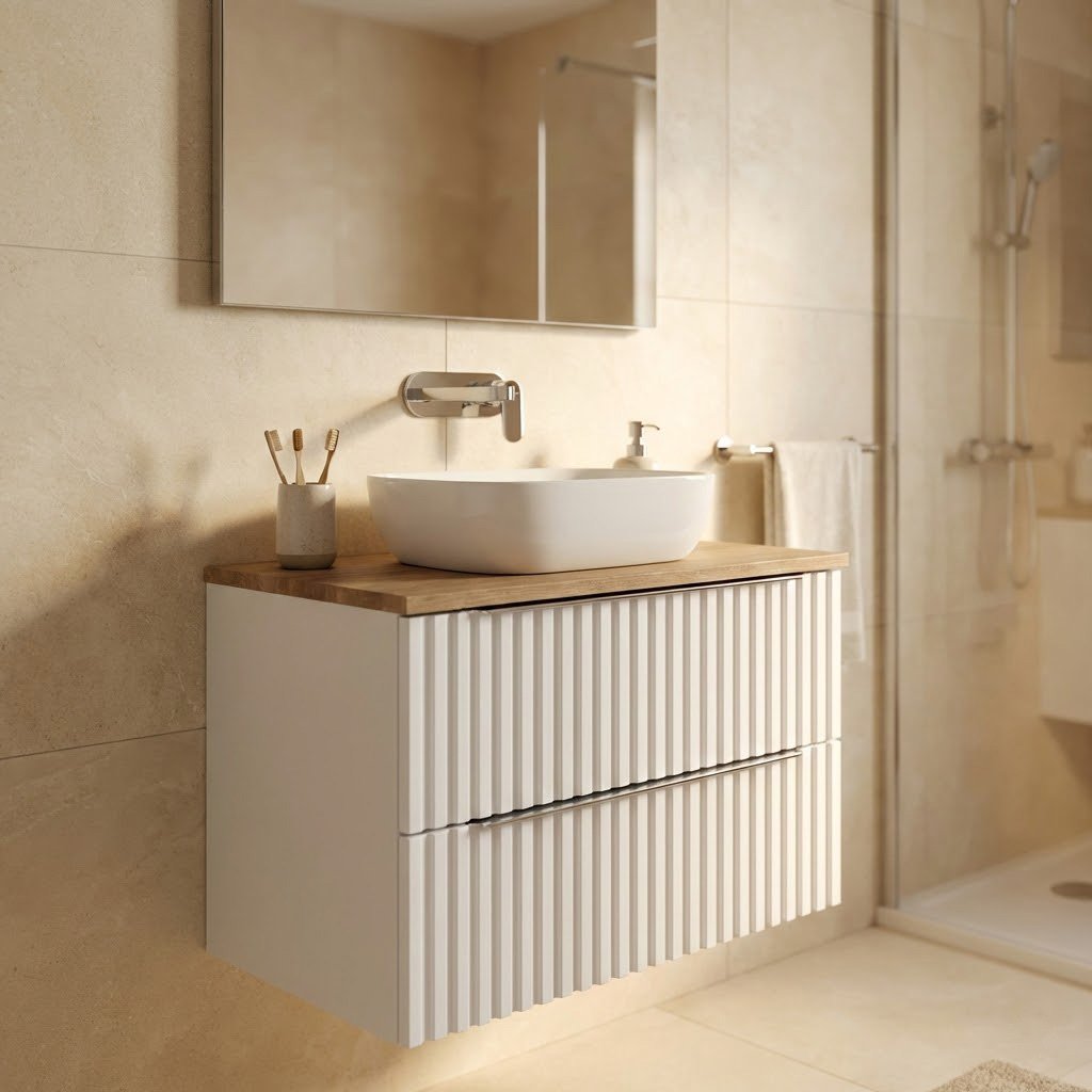 - horní deska z MDF v dekoru dub country pro umístění deskového umyvadla (bez otvoru pro umyvadlový sifon a montáž vodovodní baterie)