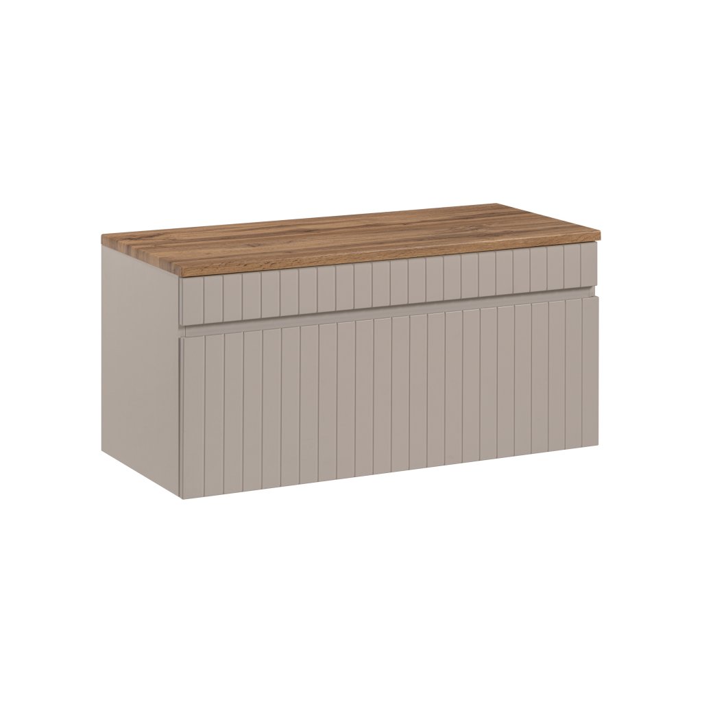 Sestava se skládá ze závěsné skříňky pod umyvadlo o šířce 100 cm s praktickou zásuvkou a stabilní horní desky. Čela jsou dekorována vertikálními frézovanými rýhami, které dodávají nábytku originální charakter a estetickou hloubku. Integrované úchyty podtrhují čistý vzhled a komfortní manipulaci, zatímco systém tichého dovírání zajišťuje plynulé a tiché používání. Konstrukce z kvalitních materiálů přispívá k dlouhé životnosti a snadné údržbě.