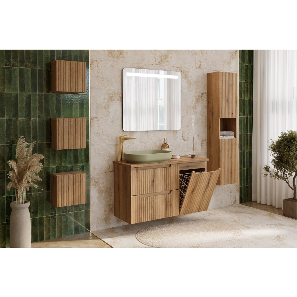 Koupelnový set Nova Coast Evoke 100 s košem na prádlo je navržen pro milovníky přírodních materiálů a čistých linií. Hlavní skříňka pod umyvadlo o šířce 600 mm nabízí dvě prostorné zásuvky vybavené špičkovým systémem tichého dovírání (softclose), který zajišťuje plynulý a bezhlučný pohyb. Na ni navazuje praktická 400 mm široká skříňka, která v sobě ukrývá vyklápěcí koš na prádlo o objemu 39 litrů. Díky tomuto řešení zůstává použité prádlo skryté, což výrazně přispívá k estetickému a uklizenému vzhledu koupelny.