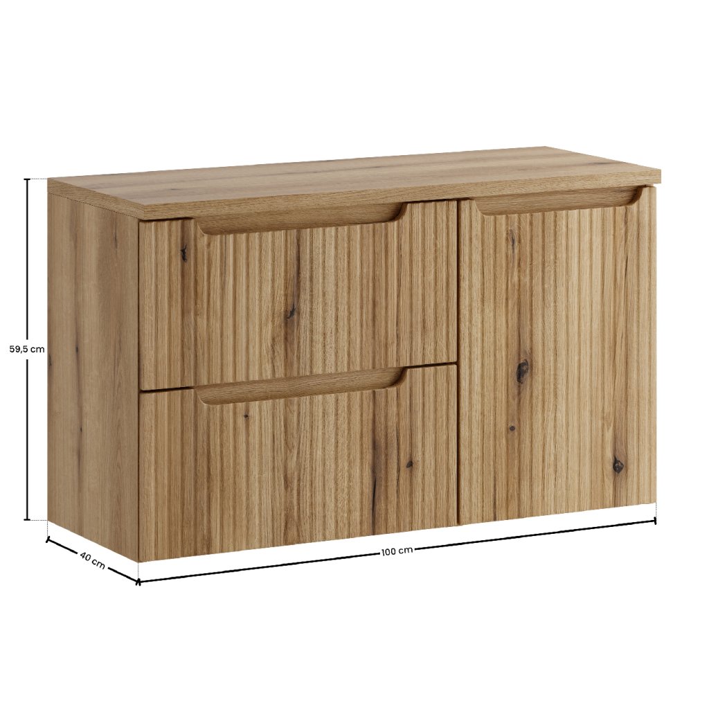 Charakteristickým znakem této sestavy jsou svisle frézované drážky na čelních plochách, které v kombinaci s dekorem dubu Coast Evoke vytvářejí moderní organický vzhled. Pro zachování maximální vizuální čistoty jsou oba moduly vybaveny integrovanými madly (podhmaty), díky čemuž lineární strukturu nábytku neruší žádné vyčnívající prvky. Celou sestavu sjednocuje horní deska Nova o tloušťce 25 mm, vyrobená z odolné laminované MDF. Set je určen k zavěšení na stěnu, což dodává nábytku lehkost, usnadňuje úklid podlahy a opticky zvětšuje prostor.