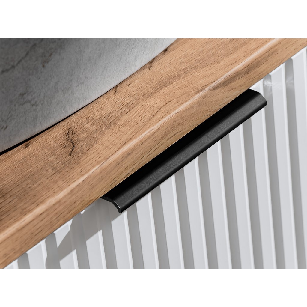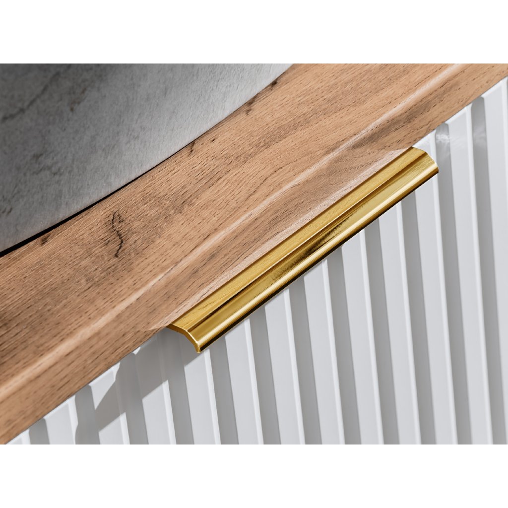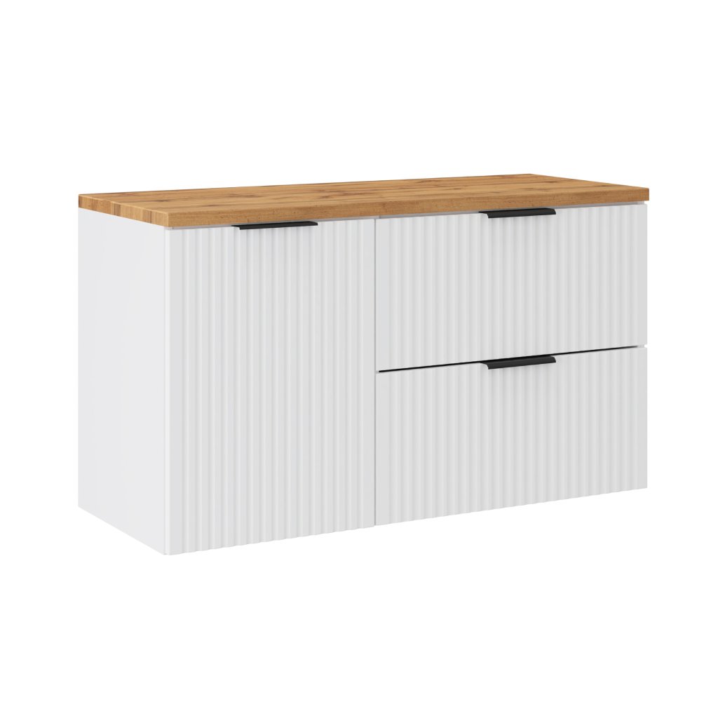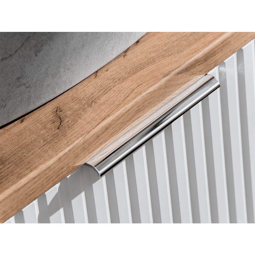 Vizuální identitu setu definují vertikálně frézovaná čela, která dodávají nábytku hloubku a sofistikovanou texturu. Zatímco skříňka Adel využívá hranová madla, modul Nova s košem sází na integrované madlo (podhmat), které neruší lineární rytmus drážkování. Horní deska Uni v dekoru dub Wotan s výraznou kresbou dřeva vytváří příjemný kontrast k bílým plochám a slouží jako stabilní základna pro libovolné umyvadlo na desku. Konstrukce z kvalitních materiálů LTD a MDF zajišťuje odolnost ve vlhkém prostředí, zatímco závěsné provedení usnadňuje údržbu a dodává sestavě moderní, vzdušný vzhled.