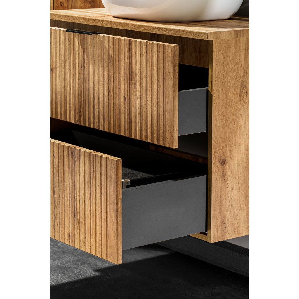 Koupelnový set z kolekce Adel Oak sestávající ze skříňky pod umyvadlo a desky Nature nabízí vizuálně silné a vysoce funkční řešení. Jednotné provedení v dekoru Dub Wotan s výrazným, propracovaným vykrojením, v kombinaci s frézovaným svislým vroubkováním na čelech, dodává interiéru autentický a moderní charakter.