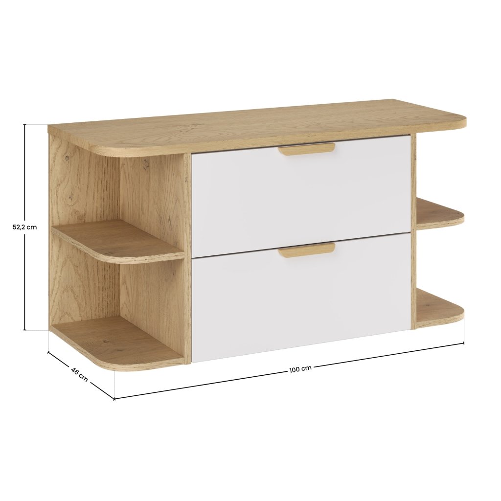 Sestavu korunuje 100 cm široká horní deska Ovalia. Její zaoblené rohy přesně kopírují linii bočních regálů a vytvářejí tak kompaktní, designově dotažený celek. Maximální uživatelský komfort zajišťuje systém tichého dovírání (softclose) u obou zásuvek, který garantuje plynulý chod a bezhlučný dojezd. Celý komplet je vyroben z kvalitních materiálů LTD a MDF s certifikací FSC, což zaručuje vysokou odolnost proti vlhkosti a dlouhou životnost. Sestava je určena k zavěšení na stěnu, což usnadňuje údržbu podlahy a dodává koupelně moderní, levitující vzhled.