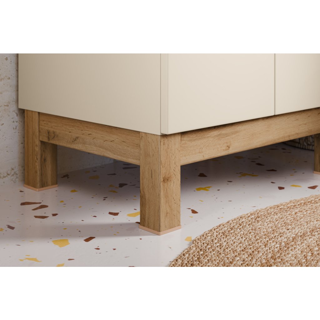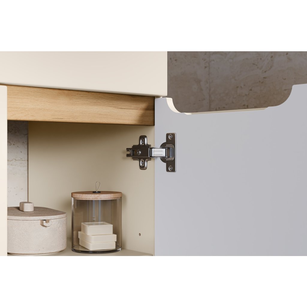 Koupelnový set z kolekce Bali Cashmere sestávající ze skříňky pod umyvadlo na nohách a desky Nature nabízí promyšlené řešení s důrazem na útulnou eleganci. Světlý dekor kašmírového matu v kombinaci s výrazným dekorem Dub Wotan s propracovaným vykrojením vytváří spojenou, minimalistickou a zároveň přírodní estetiku.