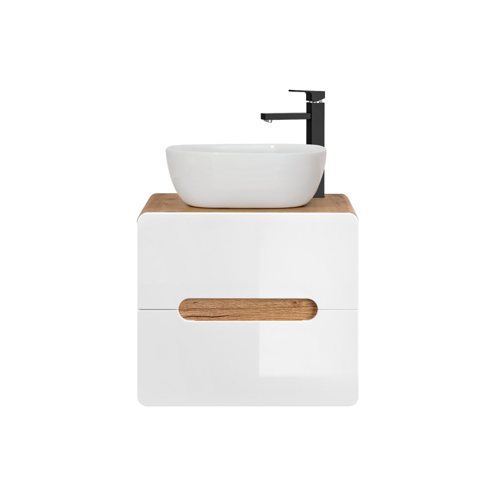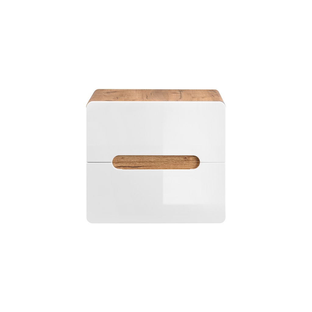 Skříňka pod umyvadlo Aruba White 60 cm je funkční úložný modul s dvěma zásuvkami, který se díky svým rozměrům a modernímu designu snadno začlení i do stísněnějších prostor. Design je založen na atraktivním kontrastu: korpus je proveden v dekoru Dub Craft Zlatý s výraznou kresbou dřeva, zatímco čela jsou v jasném Bílém Lesku se zaobleným tvarem. Toto barevné a tvarové spojení dodává skříňce svěží a moderní charakter.