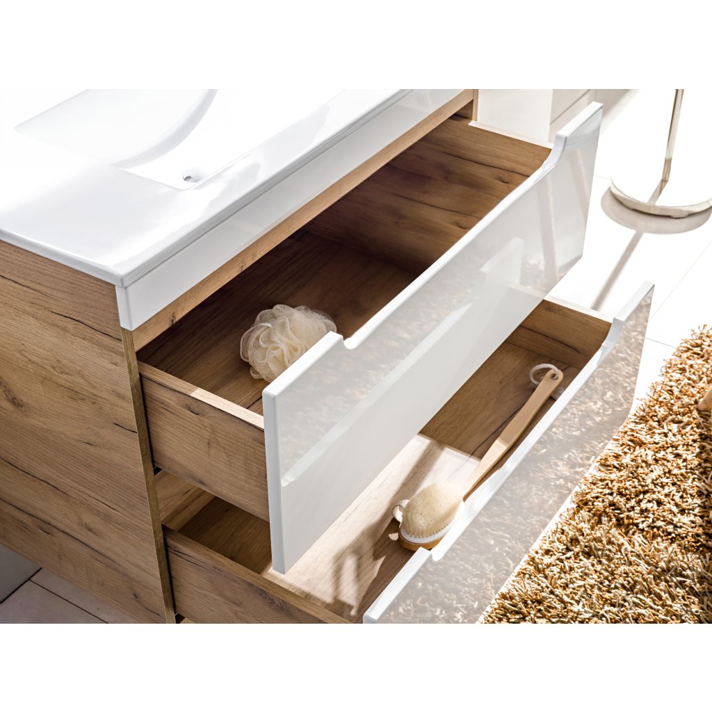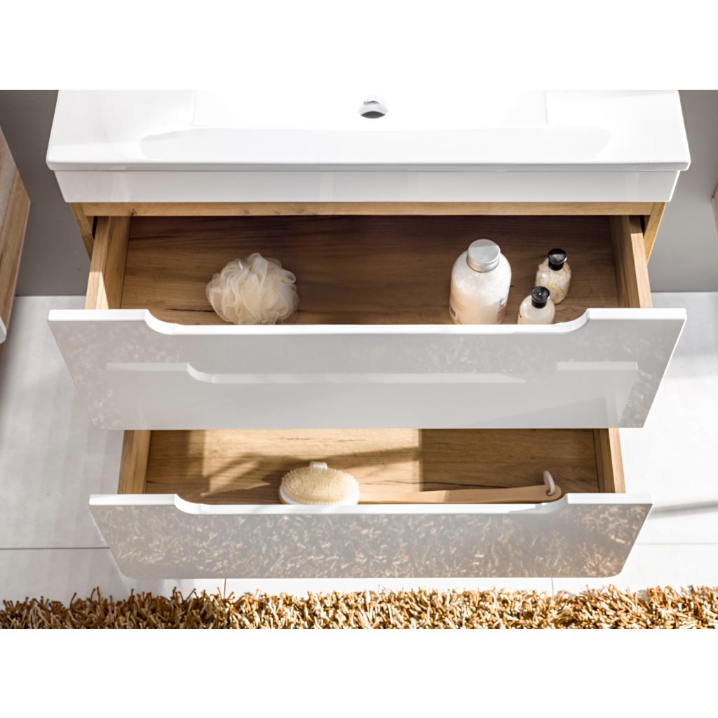 Skříňka pod umyvadlo Aruba White 80 cm je funkční úložný modul s dvěma zásuvkami, který se díky svým rozměrům a modernímu designu snadno začlení i do stísněnějších prostor. Design je založen na atraktivním kontrastu: korpus je proveden v dekoru Dub Craft Zlatý s výraznou kresbou dřeva, zatímco čela jsou v jasném Bílém Lesku se zaobleným tvarem. Toto barevné a tvarové spojení dodává skříňce svěží a moderní charakter.