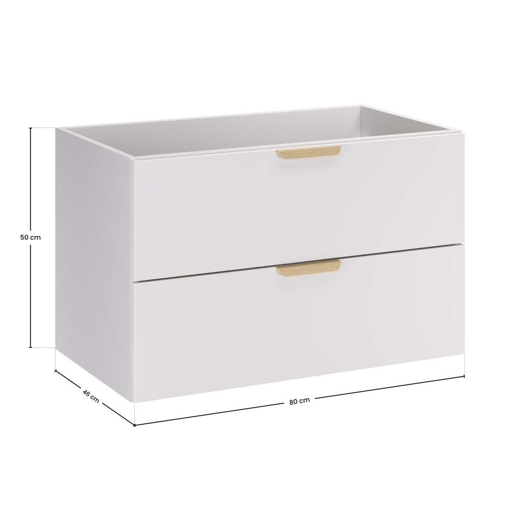 Umyvadlová skříňka z kolekce Aster White o šířce 80 cm představuje ideální volbu pro ty, kteří hledají spojení čisté estetiky a velkorysého úložného prostoru. Nadčasový odstín bílý mat dodává koupelně harmonickou atmosféru a opticky ji prosvětluje. Dominantním detailem je designový hranový úchyt v teplém dekoru dub Cremona, který tvoří přirozený kontrast k bílému korpusu. Skříňka je navržena v moderní výšce 50 cm, což ve srovnání s běžnými modely přináší odlehčený vzhled a pocit většího prostoru v koupelně při zachování plné funkčnosti.