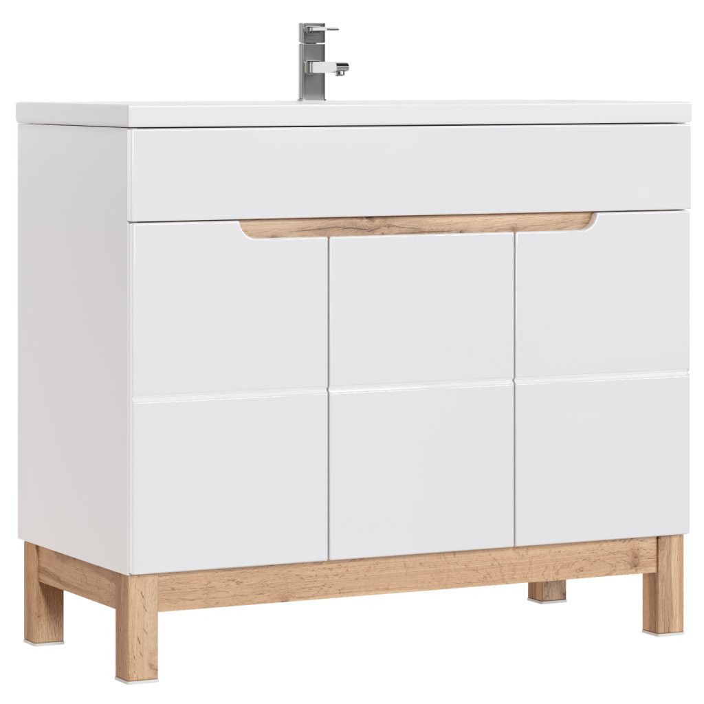 Skříňka pod umyvadlo Bali White 100 cm navozuje atmosféru čistoty a moderní elegance. Jedná se o volně stojící modul na nohách s nadčasovým charakterem, ideální do prostornějších koupelen. Skříňka kombinuje matný korpus v barvě bílá mat a čela z MDF v lesklé barvě bílý lesk. Nabízí velkorysý úložný prostor za třemi dvířky, které ukrývají vnitřní police.