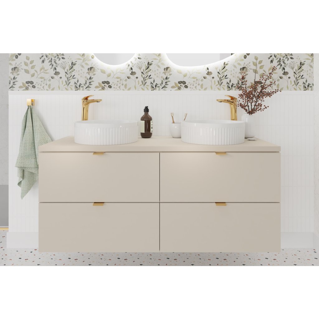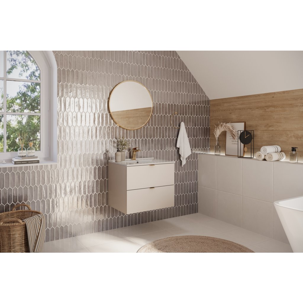 Umyvadlová skříňka z kolekce Dalia Cashmere o šířce 60 cm představuje dokonalou volbu pro ty, kteří hledají nábytek s čistými liniemi a nadčasovou barevností. Subtilní odstín kašmírový mat působí velmi přívětivě a vnáší do interiéru pocit klidu a tepla. Výrazným prvkem této řady je ergonomická výška 50 cm, která ve srovnání se standardními modely působí moderněji a opticky zvětšuje prostor koupelny. Hladká čela bez frézování podtrhují minimalistický charakter celého modulu.