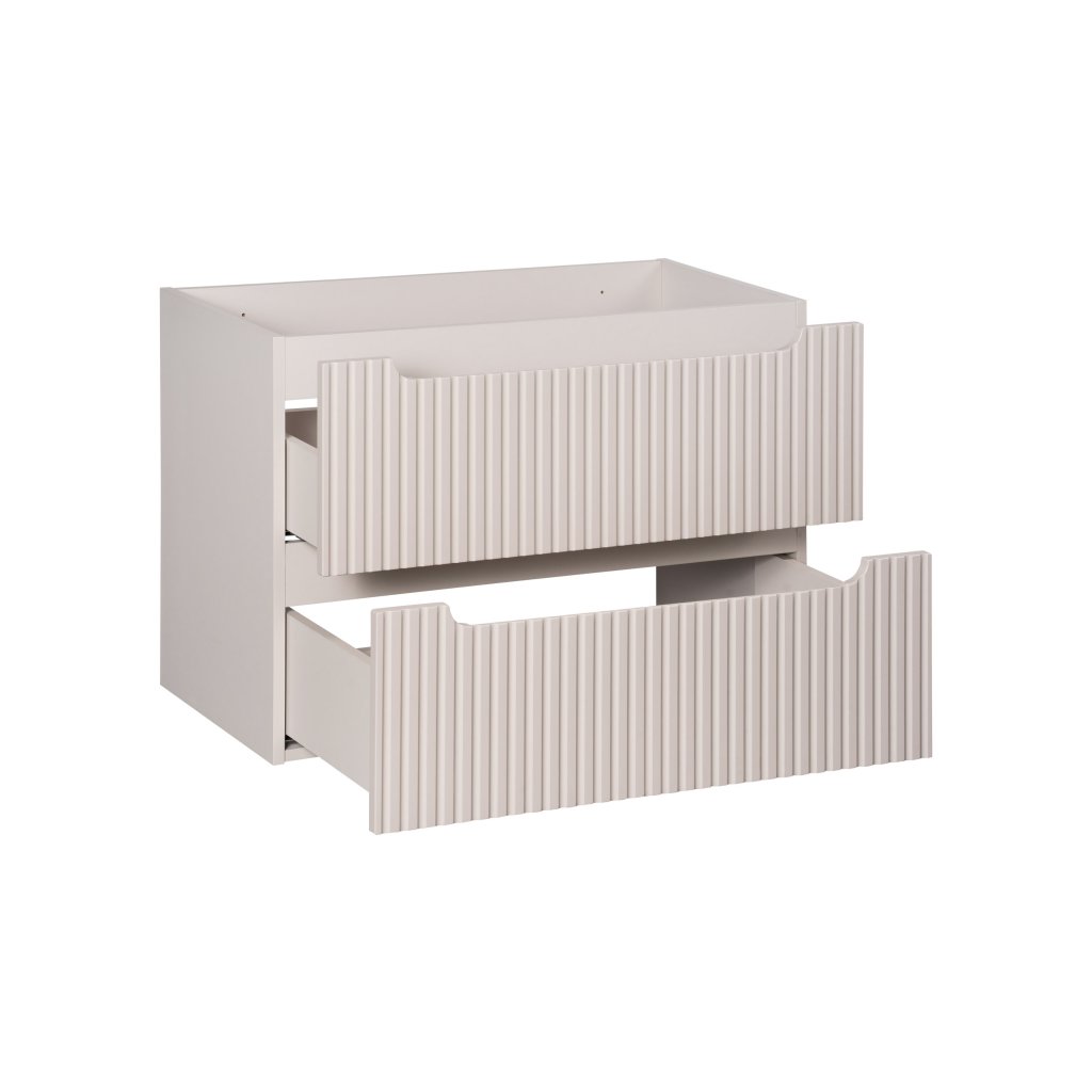 Skříňka pod umyvadlo z kolekce Nova Cashmere o šířce 80 cm se dvěma zásuvkami představuje ideální spojení špičkového designu a praktického úložného prostoru. Jemný odstín kašmírová mat vnáší do koupelny hřejivou a luxusní atmosféru. Dominantním estetickým prvkem jsou svislé frézované drážky na čelech zásuvek, které nábytku dodávají moderní texturu a nadčasový charakter.