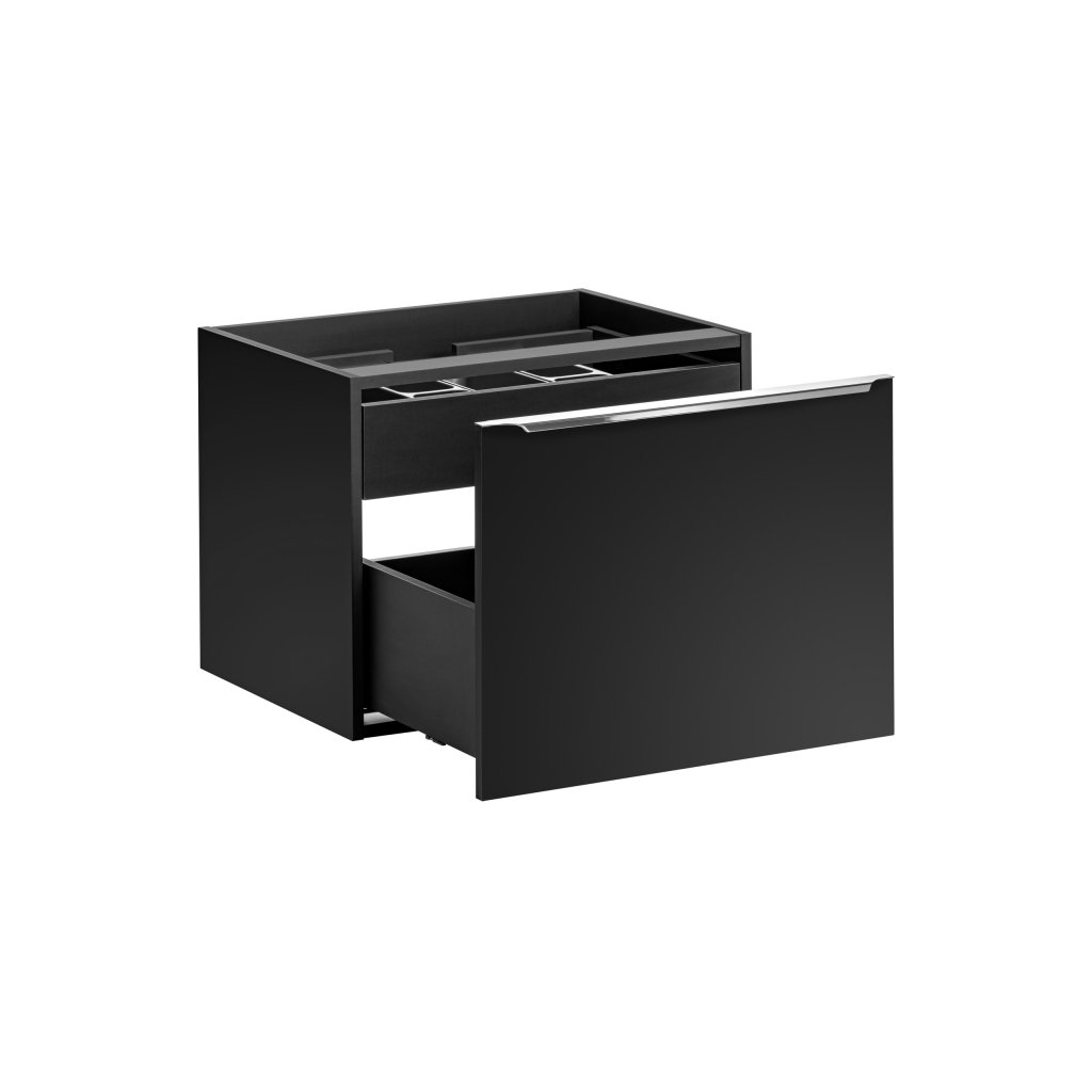 Skříňka pod umyvadlo z kolekce Santa Fe Black o šířce 60 cm představuje ideální řešení pro ty, kteří hledají eleganci a pořádek v koupelně. Celkové barevné provedení v hlubokém černém matu dodává nábytku luxusní, industriální nádech, který je jemně kontrastován chromovými úchytkami. Minimalistická hladká struktura čelních ploch podtrhuje moderní charakter celé řady Santa Fe Black.