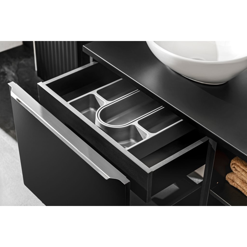 Úložný prostor je rozdělen do dvou zásuvek, které poskytují dostatek místa pro přehledné uspořádání kosmetiky a koupelnových potřeb. Vysoký komfort používání zajišťuje systém tichého dovírání, který zaručuje plynulý dojezd zásuvek a eliminuje hluk při zavírání. Skříňka je vybavena designovými hliníkovými krakvovými úchytkami, které jsou nejen estetické, ale i praktické pro každodenní manipulaci. Kombinace kvalitní laminované desky (LTD) na korpusu a MDF desky na frontách zajišťuje vysokou stabilitu a odolnost nábytku v náročném koupelnovém prostředí.
